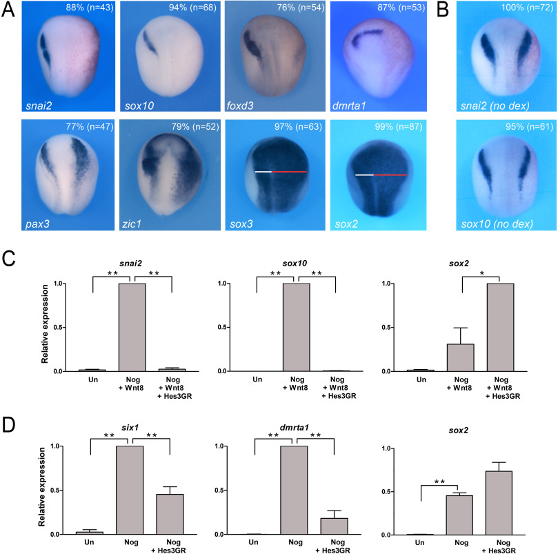 Fig. 3. Hes3 represses NPB fates. (A) Unilateral injection of hes3GR mRNA (500âpg) at the 2-cell stage followed by Dex treatment at the gastrula stage (NF stage 10.5) blocked snai2, sox10, foxd3 and dmtra1 expression, while the expression domain of pax3 and zic1 was expanded. In these embryos, the neural plate genes sox2 and sox3 were also expanded (red line). (B) Injection of hes3GR mRNA in the absence of Dex had not effect on snai2 and sox10 expression. (A-B) Dorsal views, anterior to top. Injected side is to the right. The frequency of the phenotypes shown (%) and the number of embryos analyzed (n) are indicated in the upper right corner. (C) qRT-PCR analyses indicate that Hes3GR blocks NC induction (snai2 and sox10) by Wnt8 and Noggin in animal cap explants, and promote neural plate fate (sox2). (D) Similarly, Hes3GR blocks PPR gene induction (six1 and dmtra1) by Noggin in animal cap explants. Values are normalized to ef1α and presented as mean â±â s.e.m. Statistically significant changes are indicated; (*) pâ<â0.05 and (**) pâ<â0.01 (Student's t-test), from three independent samples.