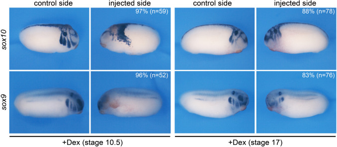 Fig. 6. Hes3 does not induce de novo a pigment cell differentiation program. Unilateral injection of hes3GR mRNA (500âpg) at the 2-cell stage followed by Dex treatment at the gastrula stage (NF stage 10.5) induced ectopic sox10 expression, and repressed sox9 expression at the tailbud stage. By contrast Dex treatment at the neurula stage (NF stage 17) had no impact on sox10 or sox9 expression. Lateral views, dorsal to top, anterior to right (control side) or anterior to left (injected side). The frequency of the phenotypes shown (%) and the number of embryos analyzed (n) are indicated in the upper right corner.