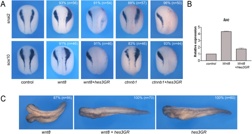 Fig. 7. Hes3 interferes with Wnt/β-catenin signaling. (A) Hes3GR blocks snai2 and sox10 induction by Wnt8 and Ctnnb1. Dorsal views, anterior to top. Injected side is to the right. (B) wnt8 (200âpg mRNA) expression activates a TOP-FLASH reporter (10âpg DNA) construct in animal cap explants, this activity is inhibited by hes3GR mRNA coinjection (1âng). (C) Ventral injection of wnt8 mRNA (50âpg) in the marginal zone of 4-cell stage embryos induces secondary axis formation. Coinjection of hes3GR mRNA (500âpg) completely blocked axis duplication by Wnt8. Dorsal views, anterior to left. (A, C) The frequency of the phenotypes shown (%) and the number of embryos analyzed (n) are indicated in the upper right corner.