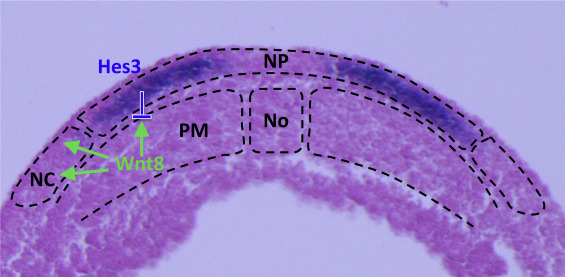Fig. 8. Model for the establishment of the NP/NC boundary by Hes3. Hes3 expression at the lateral margin of the NP restricts the response to Wnt8 to establish the NP/NC boundary. The different embryonic territories on this transverse section of a stage 15 embryo (Fig. 2S) are outlined. NC, neural crest; No, notochord; NP, neural plate; PM, paraxial mesoderm.