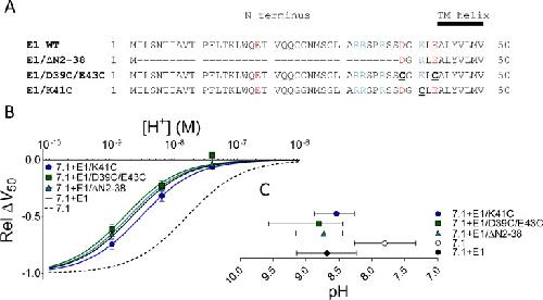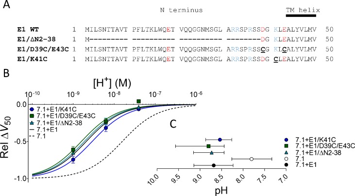 Figure 2. Removal of KCNE1 extracellular residues did not restore KV7.1-like DHA effect.(A) Sequences of the N-terminal segments of WT human KCNE1 and three different KCNE1 mutants. Acidic residues colored red and basic residues colored blue. (B) pH dependence of the DHA effect (70 µM) on the relative ÎV50 for each KCNE1 mutant co-expressed with WT KV7.1. Data shown as mean ± SEM. n = 3â6 per data point. Fits for KV7.1 alone (black dashed line) and KV7.1+E1 (solid black line) from data in Figure 1E are shown for comparison. (C) Apparent pKa for the DHA effect on indicated mutants. Data shown as mean ± asymmetrical 95% confidence interval determined using Equation 2 on the data in B (best fit with Equation 2: pKa = pH 8.7 for KV7.1+E1/âN2-38, 8.8 for KV7.1+E1/D39C/E43C, and 8.5 for KV7.1+E1/K41C).