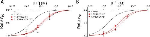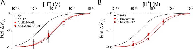 Figure 3—figure supplement 1. Alternative substitutions at position 290 support the hypothesis that the negative charge at position 290 is important for DHA protonation in the presence of KCNE1.(A) pH dependence of the DHA effect (70 µM) on the relative ΔV50 for KV7.1/E290A + E1 and KV7.1/E290C + E1 in the presence of DTT (0.5 mM DTT was added to the incubation solution and control solution to prevent disulphide bond formation during oocyte incubation and experiment). Data shown as mean ± SEM. n = 4–7 for each data point. Fit for KV7.1+E1 (solid black line) and KV7.1 alone (black dashed line) are shown for comparison. Best fit with Equation 2: pKa = pH 8.0 for KV7.1/E290A + E1, and 7.9 for KV7.1/E290C + E1 in DTT. (B) pH dependence of the DHA effect (70 µM) on the relative ΔV50 for KV7.1/E290A + E1 and KV7.1/E290R + E1. Data shown as mean ± SEM. n = 3–7 for each data point. Fit for KV7.1+E1 (solid black line) is shown for comparison. Best fit with Equation 2: pKa = pH 8.0 for KV7.1/E290A + E1, and 7.7 for KV7.1/E290R + E1.