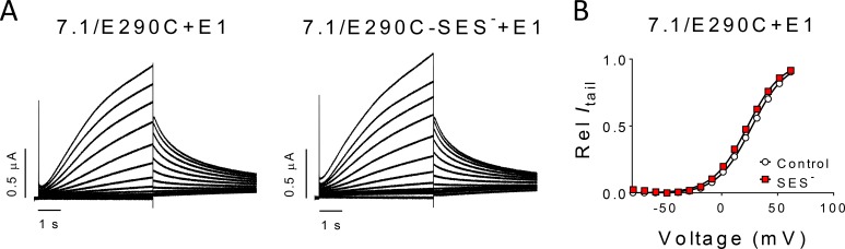 Figure 4—figure supplement 1. Lack of effect of MTSES— modification on intrinsic properties of KV7.1/E290C + E1.(A) Representative current family for KV7.1/E290C + E1 before (left) and after (right) MTSES— (10 mM) modification at pH 7.4. Activating voltage steps from −80 mV to + 60 mV from a holding voltage of −80 mV. Tail voltage to −20 mV. (B) Representative normalized G(V) curve for KV7.1/E290C + E1 before (open symbols) and after (red symbols) MTSES— (10 mM) modification. The average ∆V50 induced by MTSES— modification was −4.0 ± 2.5 mV (n = 3).