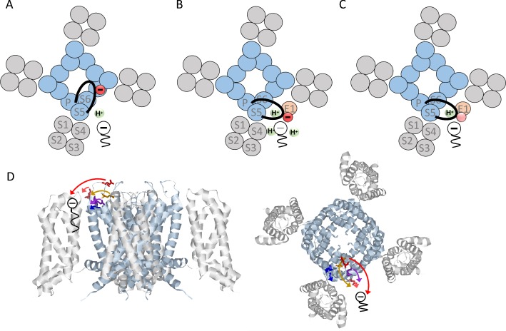 Figure 5. Proposed model of how KCNE1 induces protonation of PUFAs.(A) PUFA (black) binds to KV7.1 in the lipid-filled space between two voltage-sensing domains (grey). The negatively charged PUFA head attracts the positively charges in S4 to facilitate channel activation. In KV7.1 alone, the negatively charged S5-P-helix loop (black with red negative charge) belonging to the pore region (blue) is not close to the PUFA-binding site and will therefore not induce PUFA protonation. (B) KCNE1 (light orange) co-expression with KV7.1 induces a conformational change that moves the S5-P-helix loop closer to the PUFA. The negative charges in the S5-P-helix loop, especially E290, attract protons to the PUFA binding site, which decreases the local pH. Decreased local pH causes PUFA protonation, which renders the PUFA uncharged and ineffective. (C) When negative charges in the S5-P-helix loop are neutralized, the ability of the S5-P-helix loop to attract protons is reduced. This tends to preserve the negative charge and the activating effect of the PUFA even in the presence of KCNE1. (D) Localization of indicated residues in the S5-P-helix loop of human KV7.1, side view (left) and top-down view (right) (homology model based on the Cryo EM structure of Xenopus KV7.1 [Sun and MacKinnon, 2017] and KV1.2/2.1 [Long et al., 2007]). Arrows indicate the suggested translocation of the turret region towards the PUFA binding site. Same color coding as in Figure 3 panel B and C (E284 in purple, D286 in pink, E290 in red, E295 in orange, and D301 in blue).