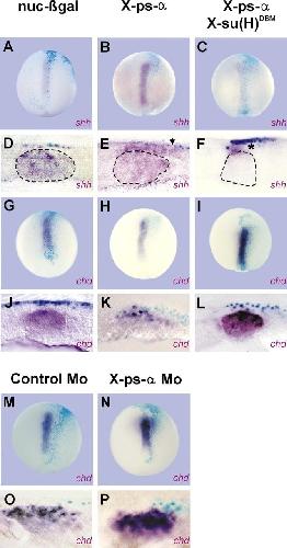Fig. 6. Presenilin up-regulates shh and down-regulates chd in a Notch-dependent way. In situ hybridisation of (A-F) shh and (G-P) chd. Whole embryos in A-C,G-I,M,N are shown in dorsal views, anterior up. (A) Stage 14 embryo injected with 4.5 ng of nuc-lacZ mRNA (nucβgal). (B) Stage 14 embryo injected with 2 ng of X-ps-α . (C) Stage 14 embryo injected with 2 ng of X-ps-α plus 2 ng of X-su(H)DBM. (D) Transverse section of the same embryo shown in A. (E) Transverse section of the same embryo shown in B. Notice the expansion of the floor plate domain of shh on the injected side (arrow). (F) Transverse cut of a stage 16 embryo injected with 2 ng of X-ps-α plus 2 ng of X-su(H)DBM. Owing to the strong inhibition, the visualisation of shh expression in 50μ m vibratome sections from these embryos was difficult. In order to appreciate differences between the injected and non-injected side, we show here a transverse cut obtained with a scalpel. The asterisk indicates the repression of shh expression in the floor plate domain on the right side, where X-gal stained cells are preferentially located. Notice that the notochord is complementarily augmented on this side. Overall, the notochord is larger than in embryos of the same stage injected with equal amounts of nuc-lacZ mRNA (not shown). The broken line in D-F outlines the notochord. (G) Stage 13 embryo injected with 4 ng of nuc-lacZ mRNA. (H) Stage 13 embryo injected with 2 ng of X-ps-α. (I) Stage 13 embryo injected with 2 ng of X-ps-α plus 2 ng of X-su(H)DBM. (J,K,L) Transverse sections of the embryos shown in G, H and I respectively. (M) Stage 12.5 embryo injected with 5 ng of a control morpholino. (N) Stage 12.5 embryo injected with 5 ng of an antisense morpholino oligonucleotide against X-ps-α. (M,P) Transverse sections of the embryos shown in M and N respectively. All sections, except F, are Nomarski interference contrast views.