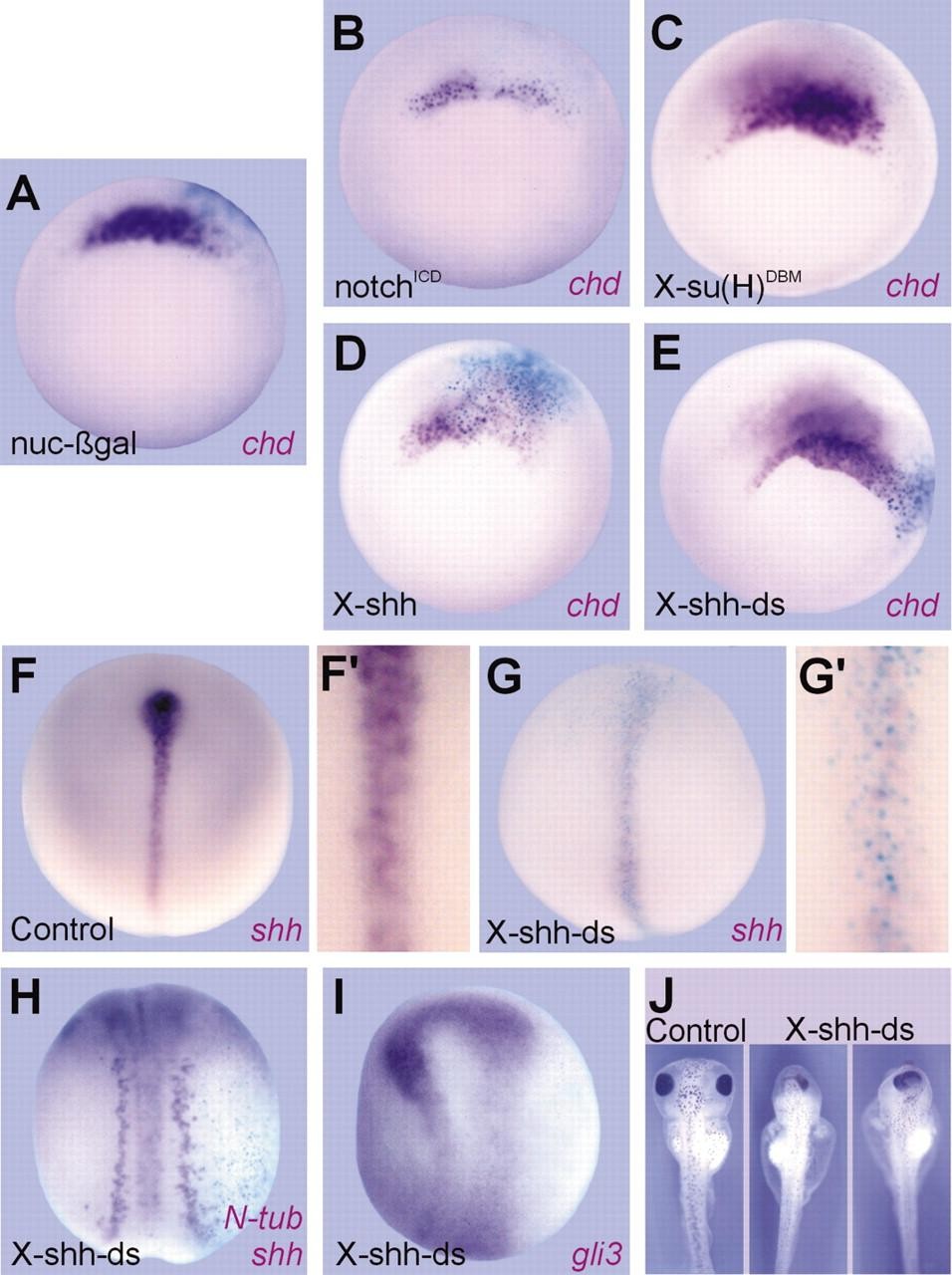 Fig. 3. Shh signalling down-regulates chd, resembling the effect of Notch. (A-E) In situ hybridisation of chd in early gastrulae, vegetal views, dorsal up, injected side on the right. (F-Gâ²) In situ hybridisation of shh in neurulae, dorsal views, anterior up. (H) In situ hybridisation of N-tubulin and shh in neurulae. (I) In situ hybridisation of gli3 in neurulae. (J) External morphology at tadpole stages. (A-E) Embryo injected with (A) 2 ng of nuc-lacZ, (B) 1 ng of notchICD, (C) 2 ng of X-su(H)DBM, (D) 1 ng of X-shh mRNA, (E) 2 ng of X-shh-ds RNA. (F) Control embryo. (Fâ²) Higher magnification of the embryo shown in F. (G) Embryo injected with 2 ng of X-shh-ds RNA to show the degradation of endogenous shh transcripts (77% of injected embryos, n=22). (Gâ²) Higher magnification of the embryo shown in G. (H,I) Embryos injected with 2 ng of X-shh-ds RNA on the right side. (J) Control embryo (left) and two embryos injected with 1 ng of X-shh-ds RNA per blastomere at the 2-cell stage showing different grades of cyclopia (right).