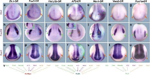 Fig. 2 Role of early ectodermal TFs for PPE and NC formation. aâu Expression of PPE (Six1, Sox3), NC (FoxD3) and neural plate (Sox3) markers in dorsal views of neural plate stage Xenopus embryos after injection of mRNAs for hormone-inducible early ectodermal TF genes and dexamethasone activation from stage 11â12. Anterior is to the bottom. Control side is shown on the left and injected side on the right (as indicated by blue LacZ staining). Reductions (arrows) and increased or ectopic expression domains (asterisks) in the neural (green) and non-neural ectoderm (orange) compared with the control side (arrowheads) are indicated. Insets show alternative phenotypes. v Summary of regulatory interactions. Arrows indicate ability of TFs to promote expression of Six1/Eya1, FoxD3 or Sox3. Bars indicate ability of TF to repress Six1/Eya1, FoxD3 or PPE Sox3. Faint colors indicate less frequent phenotypes. See Additional file 1: Tables S4 and S5 for numbers. |