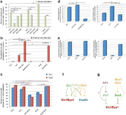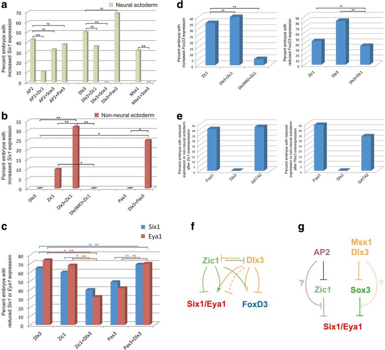 Fig. 3 Cooperation of early ectodermal TFs in PPE and NC formation. aâd Cooperative effects of TFs as revealed in coinjection experiments. Significant differences are indicated (two-tailed Fisherâs exact test; *pâ<â0.05, **pâ<â0.001; ns: not significant). See Additional file 1: Tables S4 and S6 for numbers. e Reduction of TF expression in non-neural ectoderm after overexpression of Zic1 or Pax3. See Additional file 1: Table S7 for numbers. f, g Summary of regulatory interactions. Arrows indicate positive transcriptional regulation. Bars indicate negative transcriptional regulation. Solid lines are based on both loss and gain of function data, while hatched lines are supported only by gain of function data. Faint lines with question marks in g indicate potential alternative pathways for AP2 and Msx1/Dlx3. |