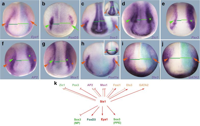 Fig. 4 Effects of Six1 knockdown on early ectodermal TFs. aâj Expression of PPE (Eya1, Sox3), NC (FoxD3), neural plate (Sox3) markers and early ectodermal TFs in dorsal views of neural plate stage Xenopus embryos after injection of Six1 MO1 + MO2. Anterior is to the bottom. Control side is shown on the left and injected side on the right (as indicated by blue LacZ staining). Reductions (arrows) and increased or ectopic expression domains (asterisks) in the neural (green) and non-neural ectoderm (orange) compared with the control side (arrowheads) are indicated. Green lines highlight broadening of the neural plate and lateral displacement of NPB markers on the injected side (bright green) versus control side (dark green). Insets show alternative phenotypes. k Summary of regulatory interactions. Arrows indicate requirement of Six1 for expression of TFs (reduction after Six1 knockdown). Bars indicate requirement of Six1 for restriction of expression of TFs (increase after Six1 knockdown). Faint colors indicate less frequent phenotypes. See Additional file 1: Table S8 for numbers. |