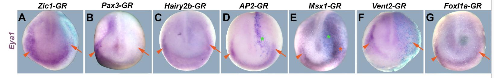 Genes referenced: dlx3 eya1 foxd3 foxi1 foxi3.2 gata2 hes4 msx1 myc npb pax3 six1 sox3 tfap2a ventx2 ventx2.2 zic1
