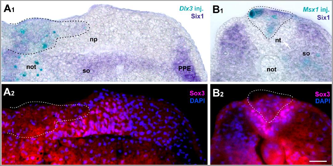 Figure S4. Six1 and Sox3 expression after overexpression of Dlx3 or Msx1. Transverse sections through neural plate or neural tube of Xenopus embryos after injection of Dlx3 (A) or Msx1 (B) mRNA and in situ hybridization for Six1. Sections are shown in brightfield (A1, B1) and in an overlay of red and UV fluorescent channels (A2, B2). LacZ (turquoise in A1 and B1) reveals the extent of mRNA injection in the neural plate (hatched outlines). Nuclei are stained by DAPI (blue). Sox3 immunopositive nuclei are shown in pink. Ectopic Six1 expression is confined to Dlx3- or Msx1-injected regions of the neural plate, which lack Sox3 immunoreactivity. Abbreviations: not, notochord, np: neural plate, nt: neural tube, PPE: preplacodal ectoderm, so: somite. Bar: 50 μm (for all panels). (PDF 659 kb) |