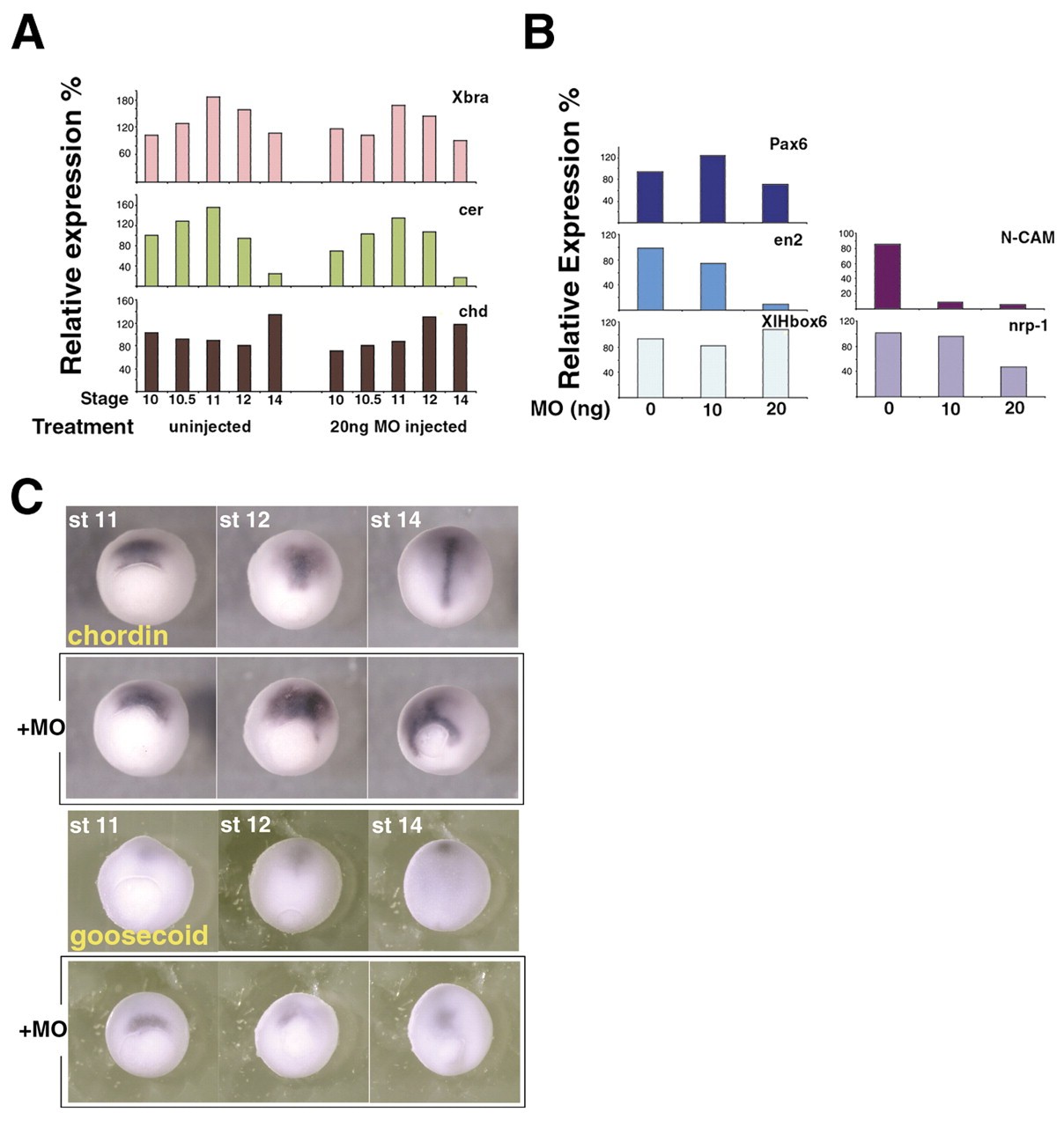 Fig. 2. Organizer genes are expressed but some neural markers are reduced in Xnr3â embryos. (A) Organizer gene expression was analyzed at gastrula and early neurula stages (stage 10, 10.5, 11, 12, 14). Xnr3 MO does not affect the expression level of organizer genes. (B) Neural markers were analyzed at stage 28 NCAM and en2 expression was repressed in MO-injected embryos. 10 ng (for late markers), or 20 ng (for both early and late markers) was injected into the dorsal marginal two cells at the 4-cell stage. In each case, ornithine decarboxylase (ODC) was used as a loading control (data not shown), and expression of each gene was normalized to the level of ODC expression. (C) chd and gsc are not expressed in the correct region in MO-injected embryos. Expression pattern of chd (top two rows), and gsc (bottom two rows) in uninjected (upper row) and MO-injected (lower row) embryos. chd was expressed normally in MO-injected embryos at stage 11, and continued to be expressed around the dorsal rim of the blastopore even at stage 14. Gsc expression in MO-injected embryos also remained adjacent to the blastopore at stage 14. 20 ng of MO was injected into the two dorsal animal cells of stage 8 albino embryos, and the expression pattern was analyzed by whole-mount in situ hybridization.