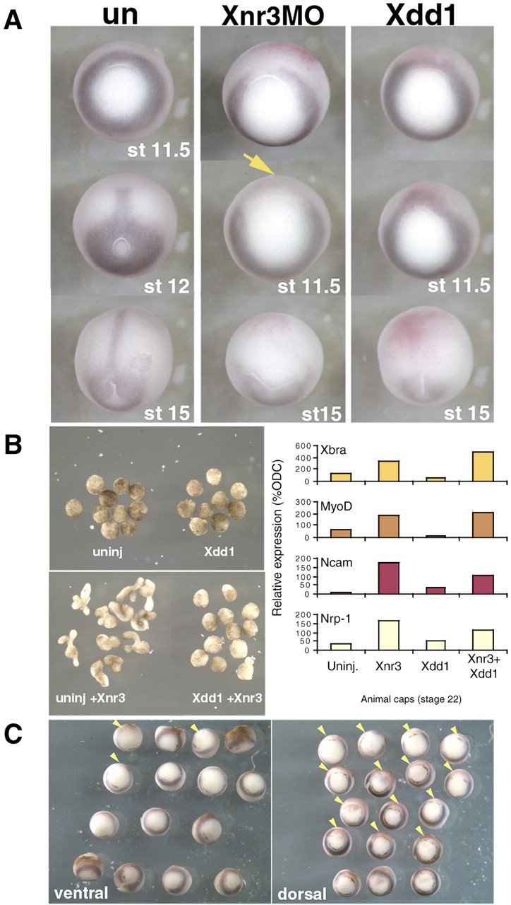 Fig. 3. The expression of Xbra is absent in the dorsal marginal region of MO-injected embryos at the gastrula stage and from the notochord region at the neurula stage. (A) The expression of Xbra in uninjected control (A), Xnr3 MO-injected (B), and Xdd1h mRNA-injected (C) embryos. Dorsal expression of Xbra was reduced at stage 11.5 (arrow) and stage 15 in the MO-injected region in Xnr3â embryos (middle column), whereas it occurred normally at stage 11.5 in Xdd1 mRNA-injected embryos (third column). Xbra expression in Xdd1 mRNA-injected embryos was lost in the neurula stage (stage 15). (B) Xnr3-induced animal cap elongation is blocked by the expression of dominant negative dishevelled mRNA (Xdd1). Xdd1 expression alone does not cause elongation of caps. These samples were frozen and subjected to real-time PCR analysis for the expression of Xbra, MyoD, NCAM and nrp1 (Fig. 3B righthand side). All these markers continue to be induced by Xnr3 in animal caps in the presence of Xdd1. (C) The dorsal reduction of Xbra expression is specific in Xnr3 MO-injected embryos. The expression of Xbra was analyzed in dorsally and ventrally injected embryos. Xbra expression in ventrally injected embryos was slightly delayed at the injected region, but was otherwise normal. Arrowheads indicate areas where Xbra expression is missing from the blastopore ring. 20 ng of MO was injected together with NLS-lacZ RNA into two dorsal or ventral marginal two cells in 8-cell-stage embryos.