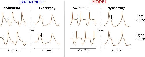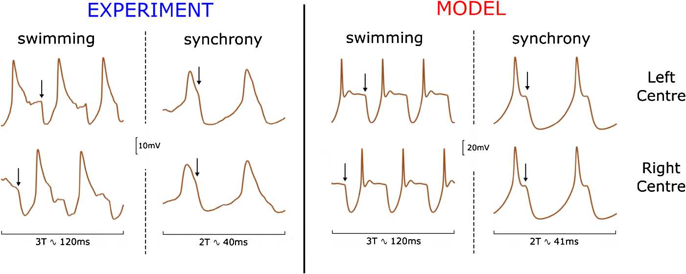 Fig. 3. Voltage traces of dINs in the reduced model during swimming and synchrony. The left panel shows experimental pairwise recordings from one left-centre dIN and one right-centre dIN during swimming and synchrony. The right panel shows the voltage variable of the two dINs of the reduced model during swimming and synchrony. We show three cycles of swimming (3T) and two cycles of synchrony (2T) to highlight the characteristic shapes of the membrane potential during these two regimes and to compare experiments and model simulations. Arrows indicate the firing of cINs and mark the inhibition preceding PIR spikes in dINs. Model parameters used to obtain swimming are \documentclass[12pt]{minimal} \usepackage{amsmath} \usepackage{wasysym} \usepackage{amsfonts} \usepackage{amssymb} \usepackage{amsbsy} \usepackage{mathrsfs} \usepackage{upgreek} \setlength{\oddsidemargin}{-69pt} \begin{document}${w}_{\mathrm{inh}} =23$\end{document}winh=23 nS, \documentclass[12pt]{minimal} \usepackage{amsmath} \usepackage{wasysym} \usepackage{amsfonts} \usepackage{amssymb} \usepackage{amsbsy} \usepackage{mathrsfs} \usepackage{upgreek} \setlength{\oddsidemargin}{-69pt} \begin{document}${w}_{\mathrm{ampa}} =12$\end{document}wampa=12 nS and \documentclass[12pt]{minimal} \usepackage{amsmath} \usepackage{wasysym} \usepackage{amsfonts} \usepackage{amssymb} \usepackage{amsbsy} \usepackage{mathrsfs} \usepackage{upgreek} \setlength{\oddsidemargin}{-69pt} \begin{document}${w}_{\mathrm{nmda}} =10$\end{document}wnmda=10 nS, with initiation parameters \documentclass[12pt]{minimal} \usepackage{amsmath} \usepackage{wasysym} \usepackage{amsfonts} \usepackage{amssymb} \usepackage{amsbsy} \usepackage{mathrsfs} \usepackage{upgreek} \setlength{\oddsidemargin}{-69pt} \begin{document}$\Delta=140$\end{document}Î=140 ms and \documentclass[12pt]{minimal} \usepackage{amsmath} \usepackage{wasysym} \usepackage{amsfonts} \usepackage{amssymb} \usepackage{amsbsy} \usepackage{mathrsfs} \usepackage{upgreek} \setlength{\oddsidemargin}{-69pt} \begin{document}${d}=6$\end{document}d=6 ms. Model parameters used to obtain synchrony are \documentclass[12pt]{minimal} \usepackage{amsmath} \usepackage{wasysym} \usepackage{amsfonts} \usepackage{amssymb} \usepackage{amsbsy} \usepackage{mathrsfs} \usepackage{upgreek} \setlength{\oddsidemargin}{-69pt} \begin{document}${w}_{\mathrm{inh}} =55$\end{document}winh=55 nS, \documentclass[12pt]{minimal} \usepackage{amsmath} \usepackage{wasysym} \usepackage{amsfonts} \usepackage{amssymb} \usepackage{amsbsy} \usepackage{mathrsfs} \usepackage{upgreek} \setlength{\oddsidemargin}{-69pt} \begin{document}${w}_{\mathrm{ampa}} =12$\end{document}wampa=12 nS and \documentclass[12pt]{minimal} \usepackage{amsmath} \usepackage{wasysym} \usepackage{amsfonts} \usepackage{amssymb} \usepackage{amsbsy} \usepackage{mathrsfs} \usepackage{upgreek} \setlength{\oddsidemargin}{-69pt} \begin{document}${w}_{\mathrm{nmda}} =10$\end{document}wnmda=10 nS, and initiation parameters \documentclass[12pt]{minimal} \usepackage{amsmath} \usepackage{wasysym} \usepackage{amsfonts} \usepackage{amssymb} \usepackage{amsbsy} \usepackage{mathrsfs} \usepackage{upgreek} \setlength{\oddsidemargin}{-69pt} \begin{document}$\Delta=0$\end{document}Î=0 ms and \documentclass[12pt]{minimal} \usepackage{amsmath} \usepackage{wasysym} \usepackage{amsfonts} \usepackage{amssymb} \usepackage{amsbsy} \usepackage{mathrsfs} \usepackage{upgreek} \setlength{\oddsidemargin}{-69pt} \begin{document}$\mathrm{d}=6$\end{document}d=6 ms. The experimental recordings have been obtained using the same experimental protocols and conditions described in [12] |