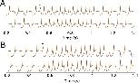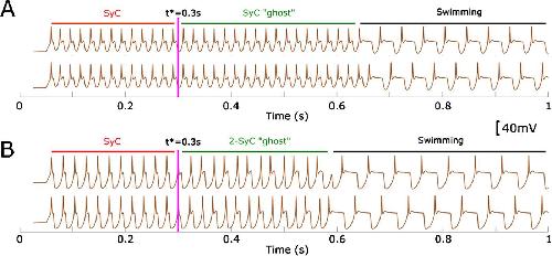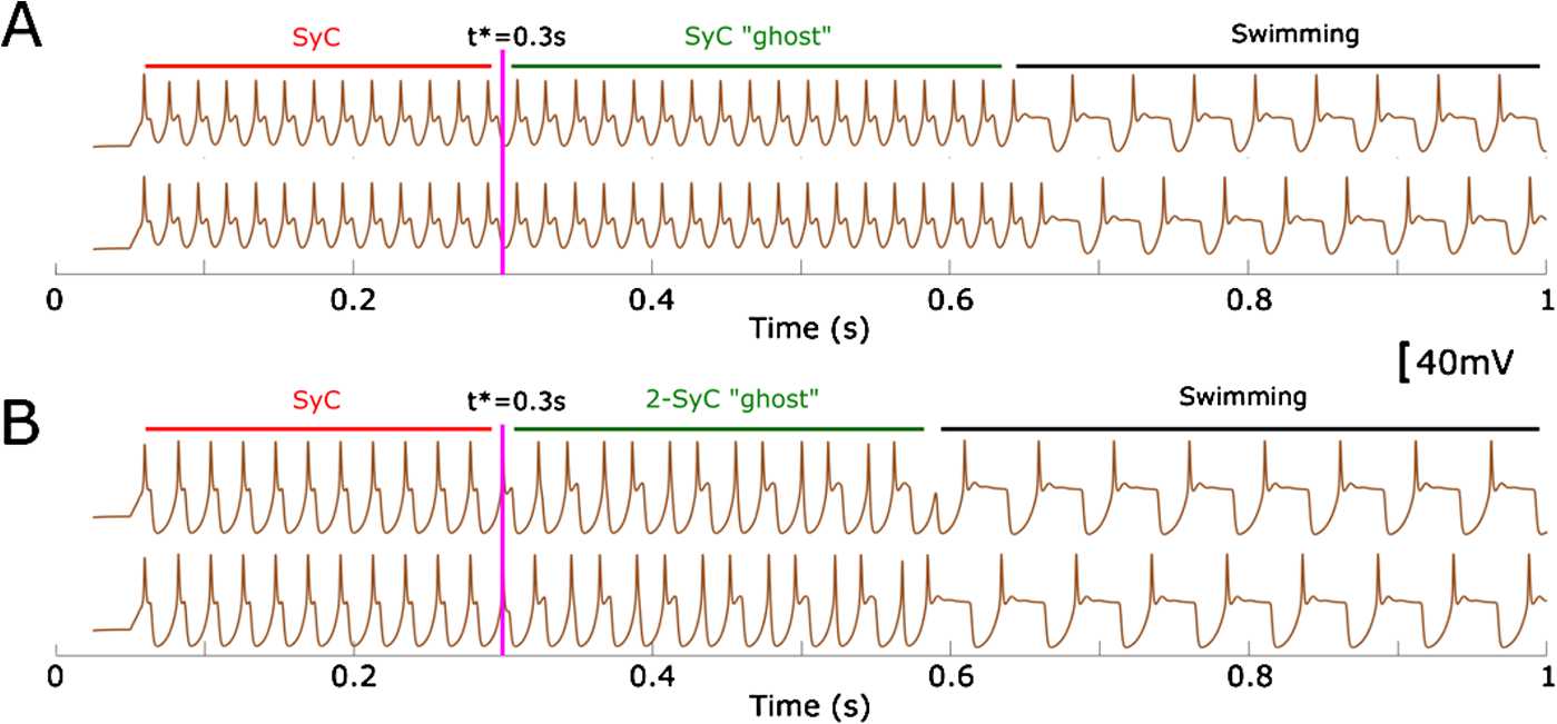 Fig. 9. Transition from synchrony to swimming. Plot of dINs’ voltage recordings at varying time shows synchronous activity before the dynamics are locked into synchronous (A) and double-synchronous regimes (B) before then converging to the swimming mode. In both (A) and (B) initiation parameters are set to winh=60 in case (B) |