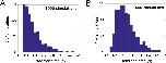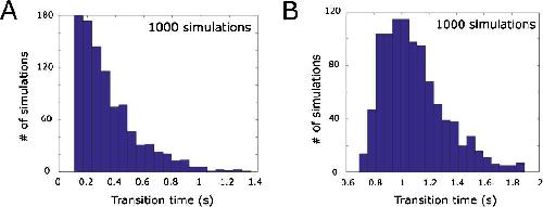 Fig. 10. Distribution of times spent in the synchrony (double-synchrony) transition in the system with noise. (A) and (B) show the histogram of times spent in synchronous state before switching to swimming. The selected parameter values of (A) and (B) are the same as the ones used in Fig. 7(A) and (B), respectively |