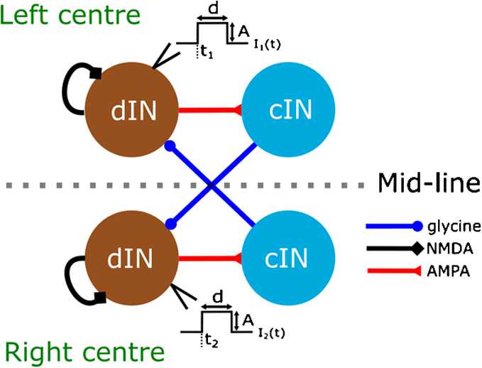 Fig. 1. Scheme of neurons and connections in the reduced model. Currents t2, respectively (see Sect. 3.1 for details) |