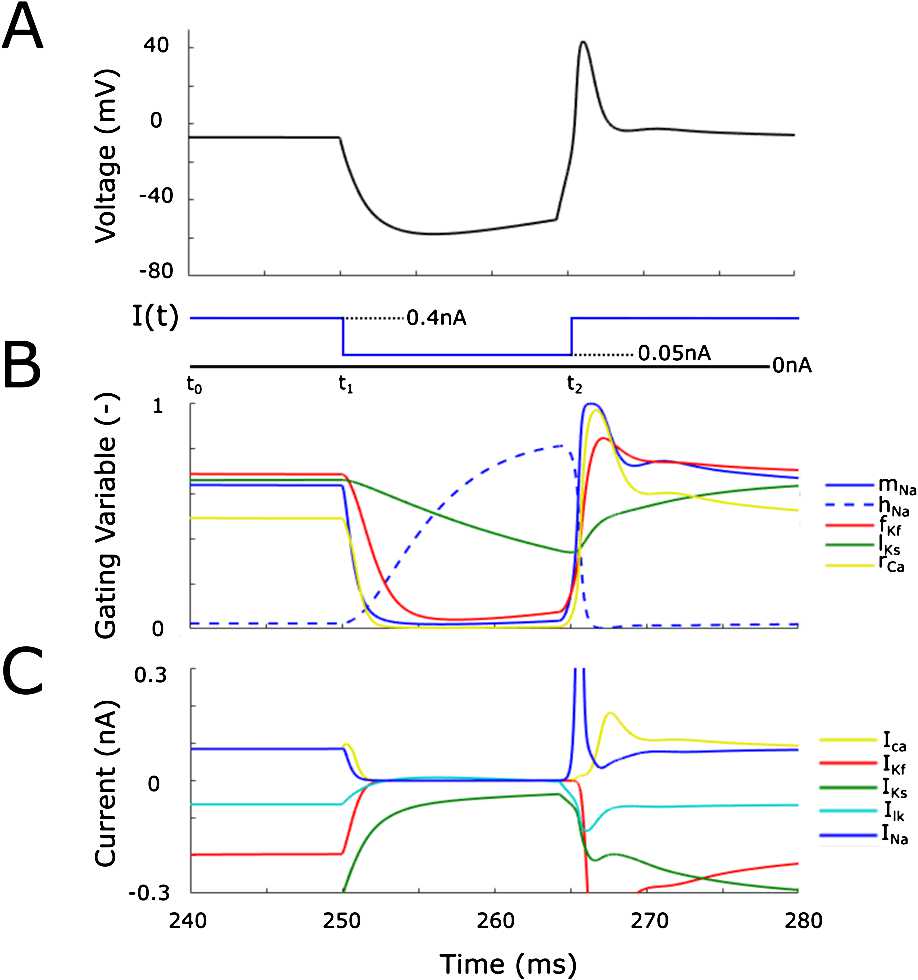 Fig. 2. Property of PIR in the dIN model. (A) Voltage dynamics in one dIN (black line) during the injection of the current function \documentclass[12pt]{minimal} \usepackage{amsmath} \usepackage{wasysym} \usepackage{amsfonts} \usepackage{amssymb} \usepackage{amsbsy} \usepackage{mathrsfs} \usepackage{upgreek} \setlength{\oddsidemargin}{-69pt} \begin{document}$I ( t )$\end{document}I(t) (blue line). (B) and (C) show the dynamics of the dINâs gating variables and ionic currents during the same current injection of part (A), respectively |