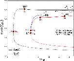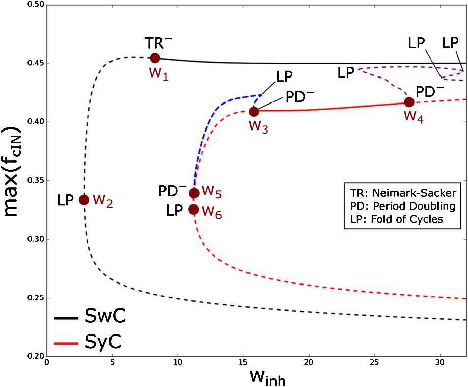 Fig. 4. One-dimensional bifurcation diagram for the swimming (black) and synchrony (red) limit cycles at varying inhibitory strength \documentclass[12pt]{minimal} \usepackage{amsmath} \usepackage{wasysym} \usepackage{amsfonts} \usepackage{amssymb} \usepackage{amsbsy} \usepackage{mathrsfs} \usepackage{upgreek} \setlength{\oddsidemargin}{-69pt} \begin{document}$w_{\mathrm{ihn}}$\end{document}wihn. Blue and purple lines show two unstable limit cycles appearing at bifurcation points \documentclass[12pt]{minimal} \usepackage{amsmath} \usepackage{wasysym} \usepackage{amsfonts} \usepackage{amssymb} \usepackage{amsbsy} \usepackage{mathrsfs} \usepackage{upgreek} \setlength{\oddsidemargin}{-69pt} \begin{document}$w_{3}$\end{document}w3 and \documentclass[12pt]{minimal} \usepackage{amsmath} \usepackage{wasysym} \usepackage{amsfonts} \usepackage{amssymb} \usepackage{amsbsy} \usepackage{mathrsfs} \usepackage{upgreek} \setlength{\oddsidemargin}{-69pt} \begin{document}$w_{4}$\end{document}w4, respectively. The y-axis shows the maximum of the \documentclass[12pt]{minimal} \usepackage{amsmath} \usepackage{wasysym} \usepackage{amsfonts} \usepackage{amssymb} \usepackage{amsbsy} \usepackage{mathrsfs} \usepackage{upgreek} \setlength{\oddsidemargin}{-69pt} \begin{document}$K_{f}$\end{document}Kf-gating variable f of the left cIN for each limit cycle. Stable and unstable limit cycles are shown by continuous and dashed lines, respectively. The superscript â refers to subcritical bifurcations. Bifurcation parameter values (in nS) are the following: \documentclass[12pt]{minimal} \usepackage{amsmath} \usepackage{wasysym} \usepackage{amsfonts} \usepackage{amssymb} \usepackage{amsbsy} \usepackage{mathrsfs} \usepackage{upgreek} \setlength{\oddsidemargin}{-69pt} \begin{document}$w_{1} =8.57$\end{document}w1=8.57, \documentclass[12pt]{minimal} \usepackage{amsmath} \usepackage{wasysym} \usepackage{amsfonts} \usepackage{amssymb} \usepackage{amsbsy} \usepackage{mathrsfs} \usepackage{upgreek} \setlength{\oddsidemargin}{-69pt} \begin{document}$w_{2} =2.86$\end{document}w2=2.86, \documentclass[12pt]{minimal} \usepackage{amsmath} \usepackage{wasysym} \usepackage{amsfonts} \usepackage{amssymb} \usepackage{amsbsy} \usepackage{mathrsfs} \usepackage{upgreek} \setlength{\oddsidemargin}{-69pt} \begin{document}$w_{3} =15.74$\end{document}w3=15.74, \documentclass[12pt]{minimal} \usepackage{amsmath} \usepackage{wasysym} \usepackage{amsfonts} \usepackage{amssymb} \usepackage{amsbsy} \usepackage{mathrsfs} \usepackage{upgreek} \setlength{\oddsidemargin}{-69pt} \begin{document}$w_{4} =27.6$\end{document}w4=27.6, \documentclass[12pt]{minimal} \usepackage{amsmath} \usepackage{wasysym} \usepackage{amsfonts} \usepackage{amssymb} \usepackage{amsbsy} \usepackage{mathrsfs} \usepackage{upgreek} \setlength{\oddsidemargin}{-69pt} \begin{document}$w_{5} =11.23$\end{document}w5=11.23 and \documentclass[12pt]{minimal} \usepackage{amsmath} \usepackage{wasysym} \usepackage{amsfonts} \usepackage{amssymb} \usepackage{amsbsy} \usepackage{mathrsfs} \usepackage{upgreek} \setlength{\oddsidemargin}{-69pt} \begin{document}$w_{6} =11.21$\end{document}w6=11.21 |