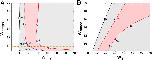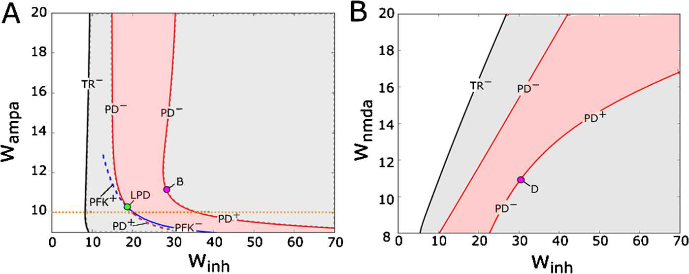 Fig. 5. Codimension-two bifurcation diagrams showing the stability regions for the swimming (light grey and red) and synchrony (light red) limit cycles under variation of (wampa=10 nS shown in Fig. 6 (orange dotted line). Bifurcation points B and D switch the criticality of the PD bifurcation (subcritical to supercritical). The LPD point is a fold-flip bifurcation point. At this point, a pitchfork bifurcation curve (PFK, blue line) interacts with a PD line and both exchange criticality |