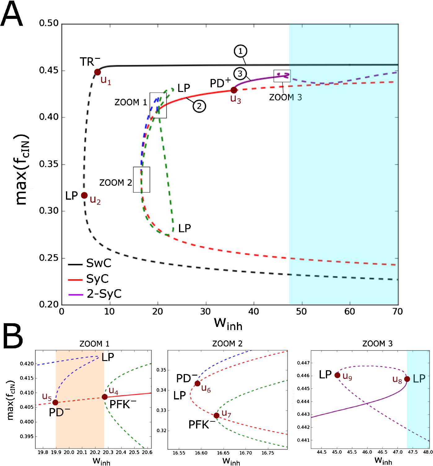 Fig. 6. (A) One-dimensional bifurcation diagram for the synchrony (red), swimming (black) and double-synchrony (purple) limit cycles at varying inhibitory strength \documentclass[12pt]{minimal} \usepackage{amsmath} \usepackage{wasysym} \usepackage{amsfonts} \usepackage{amssymb} \usepackage{amsbsy} \usepackage{mathrsfs} \usepackage{upgreek} \setlength{\oddsidemargin}{-69pt} \begin{document}$w_{\mathrm{ihn}}$\end{document}wihn and fixed parameters \documentclass[12pt]{minimal} \usepackage{amsmath} \usepackage{wasysym} \usepackage{amsfonts} \usepackage{amssymb} \usepackage{amsbsy} \usepackage{mathrsfs} \usepackage{upgreek} \setlength{\oddsidemargin}{-69pt} \begin{document}$w_{\mathrm{ampa}} =10$\end{document}wampa=10 nS and \documentclass[12pt]{minimal} \usepackage{amsmath} \usepackage{wasysym} \usepackage{amsfonts} \usepackage{amssymb} \usepackage{amsbsy} \usepackage{mathrsfs} \usepackage{upgreek} \setlength{\oddsidemargin}{-69pt} \begin{document}$w_{\mathrm{nmda}} =10$\end{document}wnmda=10 nS. The y-axis shows the maximum of the \documentclass[12pt]{minimal} \usepackage{amsmath} \usepackage{wasysym} \usepackage{amsfonts} \usepackage{amssymb} \usepackage{amsbsy} \usepackage{mathrsfs} \usepackage{upgreek} \setlength{\oddsidemargin}{-69pt} \begin{document}$K_{f}$\end{document}Kf-gating variable f of the left cIN for each limit cycle. Blue and green lines show unstable limit cycles appearing at bifurcation points \documentclass[12pt]{minimal} \usepackage{amsmath} \usepackage{wasysym} \usepackage{amsfonts} \usepackage{amssymb} \usepackage{amsbsy} \usepackage{mathrsfs} \usepackage{upgreek} \setlength{\oddsidemargin}{-69pt} \begin{document}$u_{5}$\end{document}u5 and \documentclass[12pt]{minimal} \usepackage{amsmath} \usepackage{wasysym} \usepackage{amsfonts} \usepackage{amssymb} \usepackage{amsbsy} \usepackage{mathrsfs} \usepackage{upgreek} \setlength{\oddsidemargin}{-69pt} \begin{document}$u_{4}$\end{document}u4, respectively. Stable and unstable limit cycles are shown by continuous and dashed lines, respectively. The superscript â refers to subcritical bifurcations. (B) Zoom of selected regions of Fig. 6(A) |
