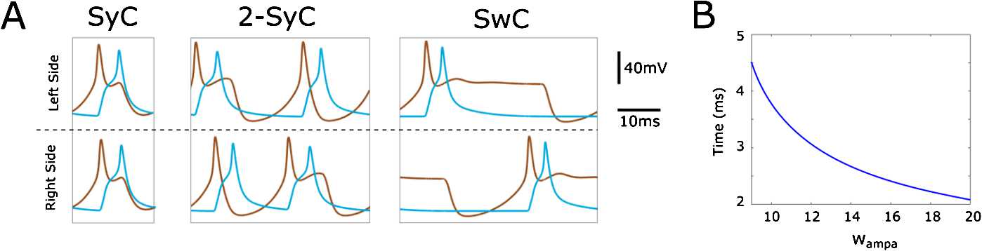 Fig. 7. (A) Time evolution of the voltage of dINs (brown lines) and cINs (blue lines) during one period of synchrony (SyC), double-synchrony (2-SyC) and swimming (SwC). The three limit cycles are detected by AUTO in Fig. 6. Synaptic strength parameters used to generate each panel SyC, 2-SyC and SwC, respectively, are \documentclass[12pt]{minimal} \usepackage{amsmath} \usepackage{wasysym} \usepackage{amsfonts} \usepackage{amssymb} \usepackage{amsbsy} \usepackage{mathrsfs} \usepackage{upgreek} \setlength{\oddsidemargin}{-69pt} \begin{document}$w_{\mathrm{inh}} =30$\end{document}winh=30 nS, 45 nS and 40 nS. (B) Time difference between left dIN and left cIN spikes during one cycle of the SwC at varying \documentclass[12pt]{minimal} \usepackage{amsmath} \usepackage{wasysym} \usepackage{amsfonts} \usepackage{amssymb} \usepackage{amsbsy} \usepackage{mathrsfs} \usepackage{upgreek} \setlength{\oddsidemargin}{-69pt} \begin{document}$w_{\mathrm{ampa}}$\end{document}wampa. The remaining vector of parameters used to obtain this figure are \documentclass[12pt]{minimal} \usepackage{amsmath} \usepackage{wasysym} \usepackage{amsfonts} \usepackage{amssymb} \usepackage{amsbsy} \usepackage{mathrsfs} \usepackage{upgreek} \setlength{\oddsidemargin}{-69pt} \begin{document}$w_{\mathrm{inh}} =60$\end{document}winh=60 nS, \documentclass[12pt]{minimal} \usepackage{amsmath} \usepackage{wasysym} \usepackage{amsfonts} \usepackage{amssymb} \usepackage{amsbsy} \usepackage{mathrsfs} \usepackage{upgreek} \setlength{\oddsidemargin}{-69pt} \begin{document}$w_{\mathrm{nmda}} =10$\end{document}wnmda=10 nS, \documentclass[12pt]{minimal} \usepackage{amsmath} \usepackage{wasysym} \usepackage{amsfonts} \usepackage{amssymb} \usepackage{amsbsy} \usepackage{mathrsfs} \usepackage{upgreek} \setlength{\oddsidemargin}{-69pt} \begin{document}$\Delta=50$\end{document}Î=50 ms and \documentclass[12pt]{minimal} \usepackage{amsmath} \usepackage{wasysym} \usepackage{amsfonts} \usepackage{amssymb} \usepackage{amsbsy} \usepackage{mathrsfs} \usepackage{upgreek} \setlength{\oddsidemargin}{-69pt} \begin{document}$d=6$\end{document}d=6 ms |