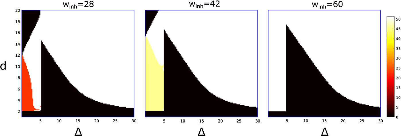 Fig. 8. Stable attractors of the reduced model at varying initiation parameters (winh=42 nS corresponds to convergence to the stable 2-synchrony, while the white regions correspond to convergence to stable swimming |