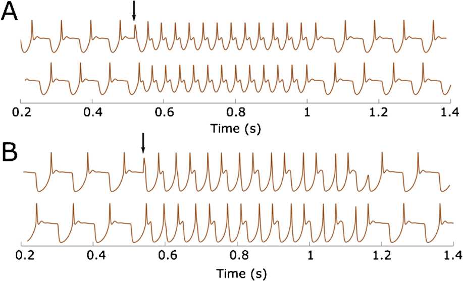 Fig. 11. Plot of dIN voltage dynamics showing transitions from swimming to synchrony (A) or double-synchrony (B), and back to swimming. In both (A) and (B) a brief step current (0.45 nA, 5 ms) is manually injected to the left dIN at the time of right dIN firing (black arrows). Parameter values used to obtain (A) and (B) are the same as the ones used in Fig. 9(A) and (B), respectively, except that \documentclass[12pt]{minimal} \usepackage{amsmath} \usepackage{wasysym} \usepackage{amsfonts} \usepackage{amssymb} \usepackage{amsbsy} \usepackage{mathrsfs} \usepackage{upgreek} \setlength{\oddsidemargin}{-69pt} \begin{document}$\Delta=50$\end{document}Î=50 |