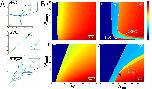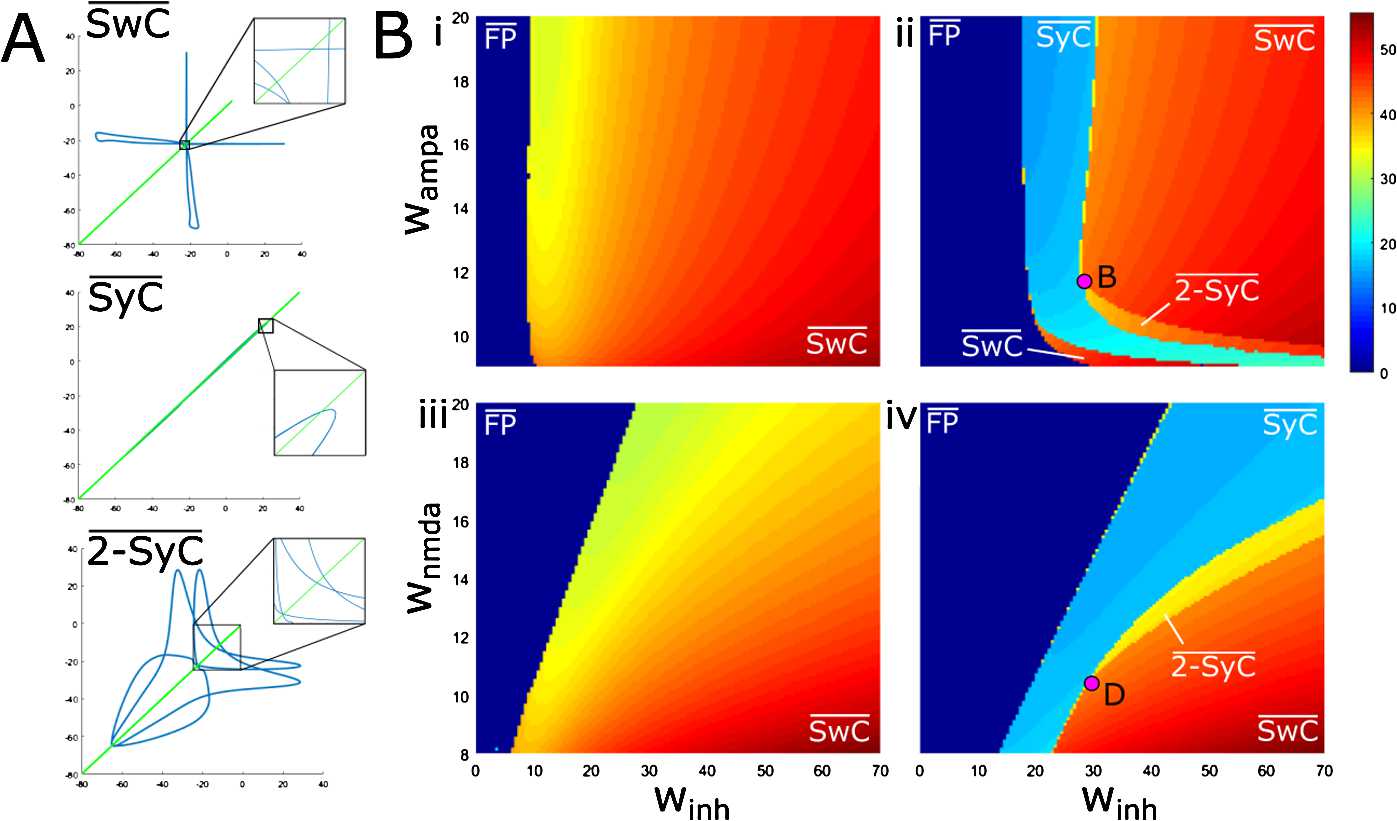 Fig. 12. Stability of the attractors of after symmetry breaking (A) Projection of the three stable limit cycles (SwCÌ , SyCÌ and \documentclass[12pt]{minimal} \usepackage{amsmath} \usepackage{wasysym} \usepackage{amsfonts} \usepackage{amssymb} \usepackage{amsbsy} \usepackage{mathrsfs} \usepackage{upgreek} \setlength{\oddsidemargin}{-69pt} \begin{document}$\overline{2-\mathrm{SyC}}$\end{document}2âSyCâ¾) to the phase plane of dINs voltages and zoom of selected regions (black boxes). The green diagonal line shows the loss of mid-line symmetry of the stable limit cycles. The vector of parameters (\documentclass[12pt]{minimal} \usepackage{amsmath} \usepackage{wasysym} \usepackage{amsfonts} \usepackage{amssymb} \usepackage{amsbsy} \usepackage{mathrsfs} \usepackage{upgreek} \setlength{\oddsidemargin}{-69pt} \begin{document}$w_{\mathrm{inh}}, w_{\mathrm{ampa}}, w_{\mathrm{nmda}},\Delta,d$\end{document}winh,wampa,wnmda,Î,d) used for the SwCÌ case are (\documentclass[12pt]{minimal} \usepackage{amsmath} \usepackage{wasysym} \usepackage{amsfonts} \usepackage{amssymb} \usepackage{amsbsy} \usepackage{mathrsfs} \usepackage{upgreek} \setlength{\oddsidemargin}{-69pt} \begin{document}$60,10,10,100,6$\end{document}60,10,10,100,6), for the SyCÌ case are (\documentclass[12pt]{minimal} \usepackage{amsmath} \usepackage{wasysym} \usepackage{amsfonts} \usepackage{amssymb} \usepackage{amsbsy} \usepackage{mathrsfs} \usepackage{upgreek} \setlength{\oddsidemargin}{-69pt} \begin{document}$25,12,10,10^{-4},6$\end{document}25,12,10,10â4,6), and for the \documentclass[12pt]{minimal} \usepackage{amsmath} \usepackage{wasysym} \usepackage{amsfonts} \usepackage{amssymb} \usepackage{amsbsy} \usepackage{mathrsfs} \usepackage{upgreek} \setlength{\oddsidemargin}{-69pt} \begin{document}$\overline{2-\mathrm{SyC}}$\end{document}2âSyCâ¾ case are (\documentclass[12pt]{minimal} \usepackage{amsmath} \usepackage{wasysym} \usepackage{amsfonts} \usepackage{amssymb} \usepackage{amsbsy} \usepackage{mathrsfs} \usepackage{upgreek} \setlength{\oddsidemargin}{-69pt} \begin{document}$40,10,10,10^{-4},6$\end{document}40,10,10,10â4,6) (B) Period of the attracting limit cycle found by numerical simulation at varying (\documentclass[12pt]{minimal} \usepackage{amsmath} \usepackage{wasysym} \usepackage{amsfonts} \usepackage{amssymb} \usepackage{amsbsy} \usepackage{mathrsfs} \usepackage{upgreek} \setlength{\oddsidemargin}{-69pt} \begin{document}$w_{\mathrm{inh}}, w_{\mathrm{ampa}}$\end{document}winh,wampa) and fixed \documentclass[12pt]{minimal} \usepackage{amsmath} \usepackage{wasysym} \usepackage{amsfonts} \usepackage{amssymb} \usepackage{amsbsy} \usepackage{mathrsfs} \usepackage{upgreek} \setlength{\oddsidemargin}{-69pt} \begin{document}$w_{\mathrm{nmda}} =10$\end{document}wnmda=10 nS in cases (i)â(ii) and at varying (\documentclass[12pt]{minimal} \usepackage{amsmath} \usepackage{wasysym} \usepackage{amsfonts} \usepackage{amssymb} \usepackage{amsbsy} \usepackage{mathrsfs} \usepackage{upgreek} \setlength{\oddsidemargin}{-69pt} \begin{document}$w_{\mathrm{inh}}, w_{\mathrm{nmda}} $\end{document}winh,wnmda) and fixed \documentclass[12pt]{minimal} \usepackage{amsmath} \usepackage{wasysym} \usepackage{amsfonts} \usepackage{amssymb} \usepackage{amsbsy} \usepackage{mathrsfs} \usepackage{upgreek} \setlength{\oddsidemargin}{-69pt} \begin{document}$w_{\mathrm{ampa}} =12$\end{document}wampa=12 nS in cases (iii), (iv). Initiation parameters for cases (i)â(iii) are \documentclass[12pt]{minimal} \usepackage{amsmath} \usepackage{wasysym} \usepackage{amsfonts} \usepackage{amssymb} \usepackage{amsbsy} \usepackage{mathrsfs} \usepackage{upgreek} \setlength{\oddsidemargin}{-69pt} \begin{document}$\Delta=50 $\end{document}Î=50 and \documentclass[12pt]{minimal} \usepackage{amsmath} \usepackage{wasysym} \usepackage{amsfonts} \usepackage{amssymb} \usepackage{amsbsy} \usepackage{mathrsfs} \usepackage{upgreek} \setlength{\oddsidemargin}{-69pt} \begin{document}$d=6$\end{document}d=6, while for cases (ii)â(iv) are \documentclass[12pt]{minimal} \usepackage{amsmath} \usepackage{wasysym} \usepackage{amsfonts} \usepackage{amssymb} \usepackage{amsbsy} \usepackage{mathrsfs} \usepackage{upgreek} \setlength{\oddsidemargin}{-69pt} \begin{document}$\Delta= 10^{-4}$\end{document}Î=10â4 and \documentclass[12pt]{minimal} \usepackage{amsmath} \usepackage{wasysym} \usepackage{amsfonts} \usepackage{amssymb} \usepackage{amsbsy} \usepackage{mathrsfs} \usepackage{upgreek} \setlength{\oddsidemargin}{-69pt} \begin{document}$d=6$\end{document}d=6 |