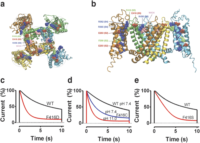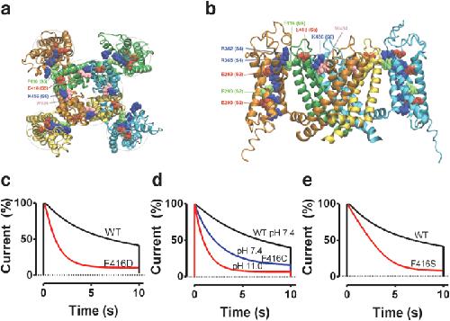 Figure 1. The pore domain/VSD interface is important for C-type inactivation.(a,b) Molecular structure of the Shaker Kv channel (top view in a, side view in b). Four identical voltage-sensor domains (VSDs) surround the pore domain. The voltage sensor S4 (positively charged residues in blue) is in an activated up-state. For clarity, the VSDs in the front and the back are removed (b). Labelled residues are discussed in this paper. (c–e) Effects of different mutations and pH on the inactivation time course and steady-state current. Test step voltage = +80 mV. Holding voltage = −80 mV. pH = 7.4 if not otherwise noted.