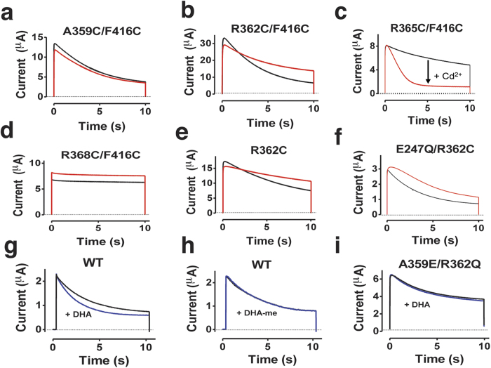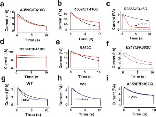 Figure 2. Interactions between F416C of S5 and residues of S4 affect C-type inactivation.(a–e) 10 μM Cd2+ (red) affects the time course of slow inactivation in R362C/F416C (b) and R365C/F416C (c) but not in R359C/F416C (a) or R368C/F416C (d). Control in black. (e) 10 μM Cd2+ (red) slows down inactivation in R362C single mutant. (f) 10 μM Cd2+ (red) does not affect the inactivation time constant in E247Q/R362C. (g) 70 μM DHA (blue) accelerates inactivation in Shaker wt. (h) 70 μM DHA-me (blue) does not accelerate inactivation in Shaker wt. (i) 70 μM DHA (blue) only has a minor effect on inactivation in A359E/R362Q. For all panels, test step voltage = +80 mV, holding voltage = −80 mV, pH = 7.4.