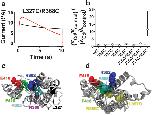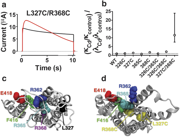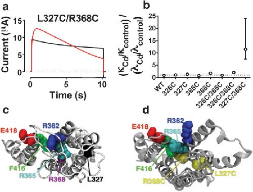 Figure 3. Interactions between S3 and S4 in the VSD affect C-type inactivation.(a) 10 μM Cd2+ (red) inactivates L327C/R368C to a lower steady-state current. Control in black. Test step voltage = +80 mV. Holding voltage = −80 mV. pH = 7.4. (b) Quotient of Cd2+ effects on the rate constants λ and κ calculated according to Scheme I (see Methods for details) for eight different channels. Error bars are calculated from the inverse of the data. n = 3–4. (b) Top view of model of the VSD and S5 of the Shaker channel based on a crystallographic structure. (d) Top view of the model based on our experimental data. Note how a Cd2+ bridge between L327C and R368C lifts R365 (cyan) above F416 (green) without moving more positive gating charges across the central hydrophobic barrier of the VSD.