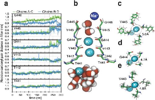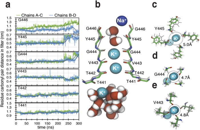 Figure 4. Molecular modelling of the mechanism for C-type inactivation.(a) Distances between the α carbons for six residues in the selectivity filter during a 300 ns long MD simulation when all four 416 residues are pulled away from the center of the channel at a rate of 0.001 nm/ns (see Methods for details). After 229 ns (vertical line) the distances are abruptly altered and the first K+ leaves the filter array. (b) A snapshot at the time of the filter collapse (229 ns) shows that the array of K+ in the selectivity filter retreat downwards. Water and Na+ interact with carbonyls (red sticks) in positions 445 and 446. Structure is aligned to initial frame of the simulation (grey sticks) with regard to N, CA, C, and O backbone atoms in position 441 to 446 of all four chains. (c–e) Filter distortion (top view). At positions 445 (c) and 444 (d) there is an increase in filter diameter (average of distances between carbonyls of opposing chains) compared to initial structure (grey sticks, dotted circle). At position 443 (e) there is a decrease in filter diameter. There is also side chain rotations of Y445 at the moment of filter collapse (c).