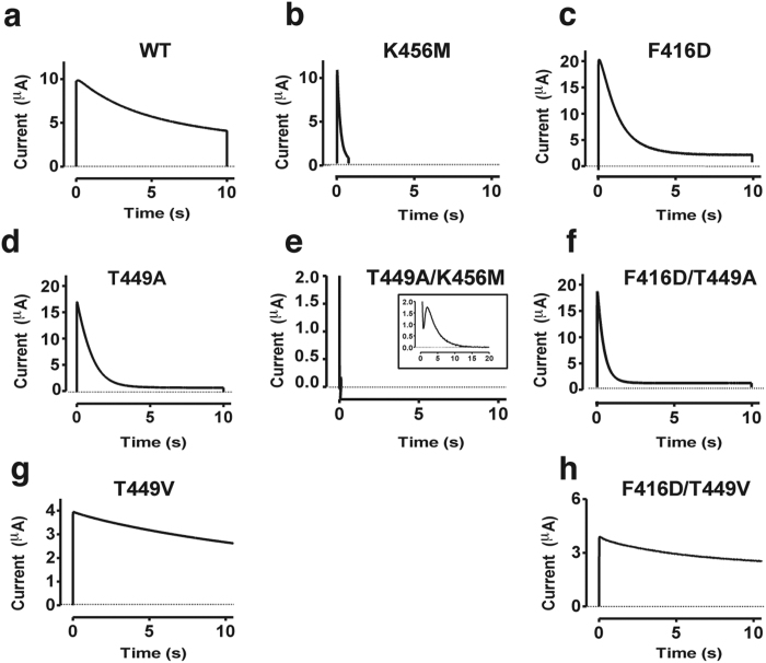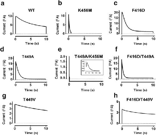 Figure 5. Concerted action within a subunits during C-type inactivation.(a–h) Inactivation of eight different channels as denoted in the panels. Test step voltage = +80 mV; holding voltage = −80 mV; pH = 7.4. An inset is shown for T449A/K456M for a 20 ms long pulse (e). The pulses for T449V (g) and F416D/T449V (h) were 60 s long but for comparative reasons only 10 s are shown.
