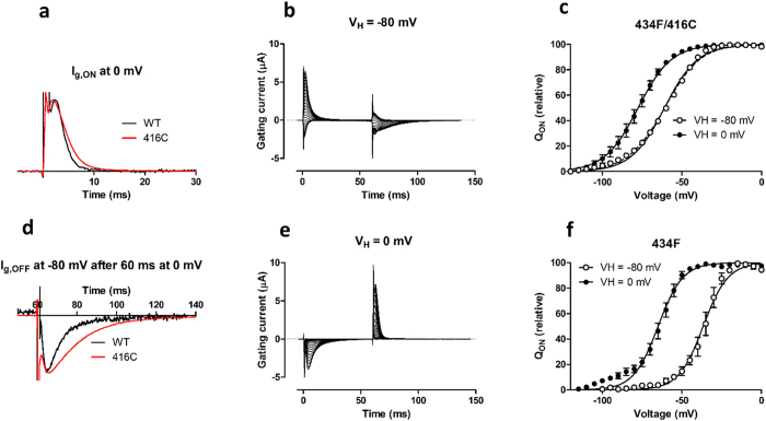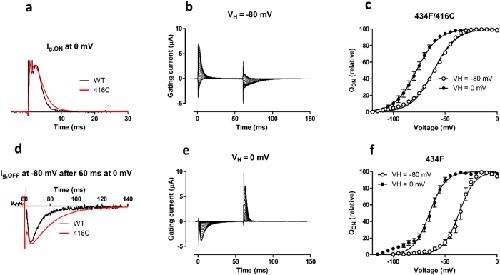 Figure 6. F416C in the pore domain affects molecular motions within the VSD.(a) ON gating currents at 0 mV. Holding voltage VH = −80 mV. (b) Gating currents of F416C/W434F. VH = −80 mV. (c) Charge vs voltage of F416C/W434F calculated from ON gating currents. VH = 0 mV (black symbols), VH = −80 (white symbols). The continuous curves are best fits to Eq. 2 with a shared slope value. V½(−80 mV) = −61.0 mV, V½(0 mV) = −77.5 mV. The dashed curve is the best fit of a sum of two Boltzmanns’ curves (Eq. 2), where V½ for one component was fixed to −77.5 mV. V½ for the other component was determined to −58.3 mV. (d) OFF gating currents at −80 mV after 60 ms at 0 mV. (e) Gating currents of F416C/W434F. VH = 0 mV. (f) Charge vs voltage of W434F calculated from ON gating currents. VH = 0 mV (black symbols), VH = −80 mV (white symbols). The continuous curves are best fits to Eq. 2 with a shared slope value. V½(−80 mV) = −36.6 mV; V½(0 mV) = −64.9. All the recordings were done at pH 7.4.