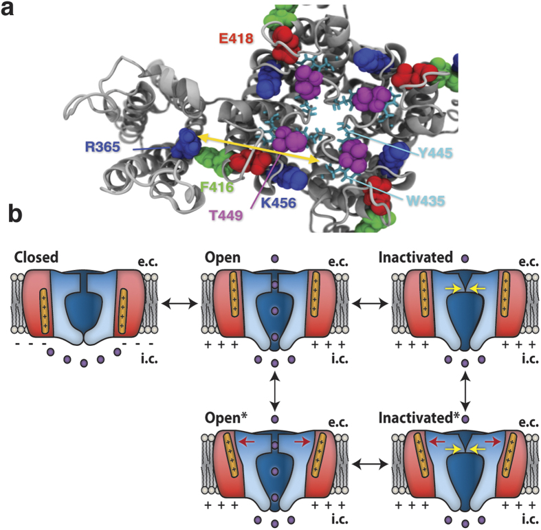 Figure 7. Mechanisms for C-type inactivation.(a) Molecular structure of one VSD (left) and the pore domain (right). Important residues explored in this study are space filled. Yellow double-directed arrow denotes approximate path for the molecular signal. (b) Postulated inactivation and Q(V)-shift pathways. Pore domain (blue), VSD (red), S4 (orange). Depolarization shifts the channel from a closed state to an open state. Prolonged depolarization either (1) rearranges the selectivity filter (inactivated state), and then alters the outer pore domain and S4 (inactivated* state), or (2) alters the outer pore domain and S4 (open* state), and then rearranges of the selectivity filter (inactivated* state).