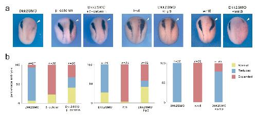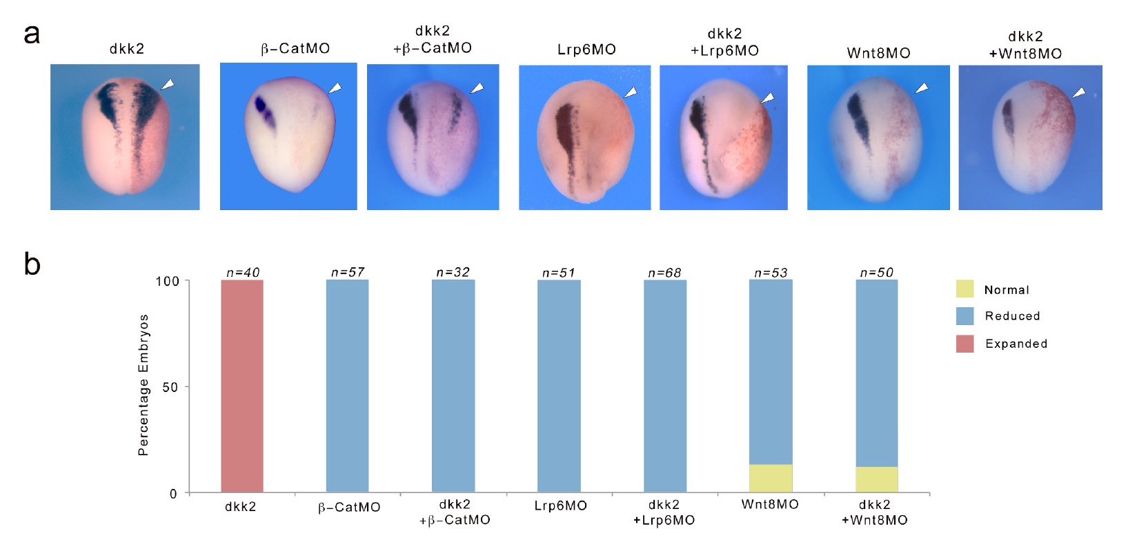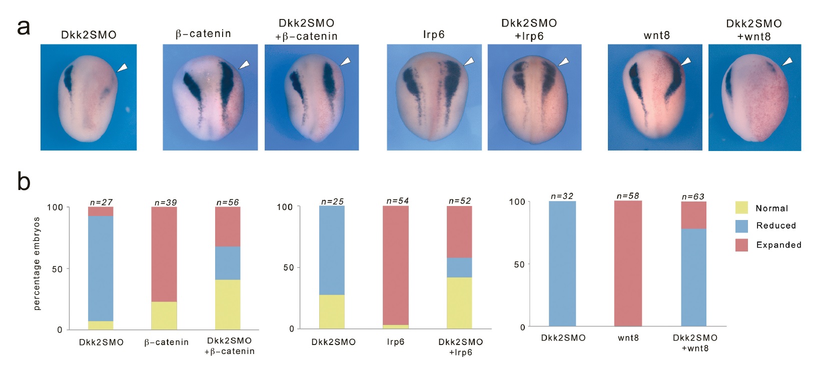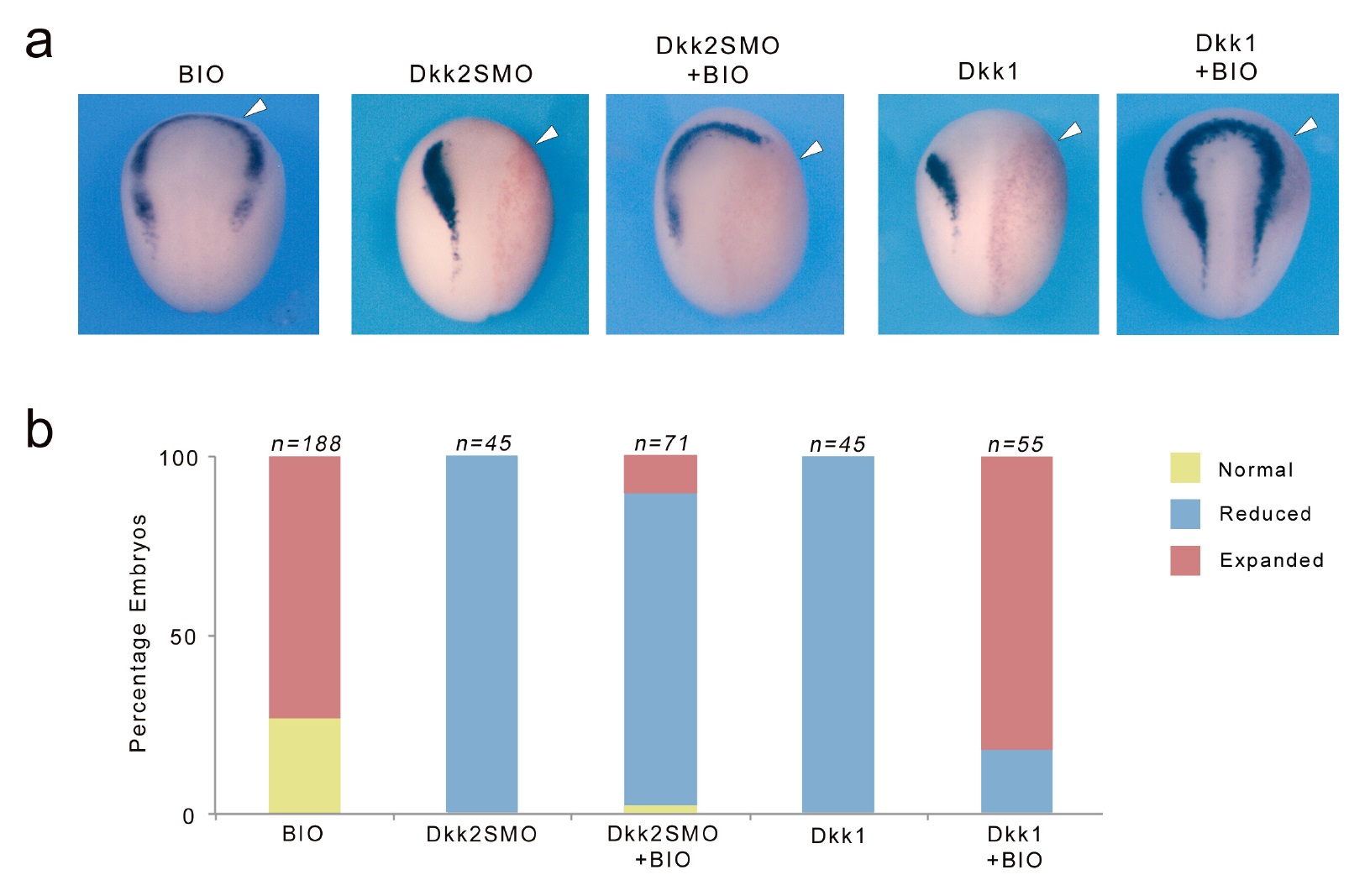 retention. For all samples, the RT-PCR was performed under the same experimental conditions. (g) Unilateral injection of Dkk2SMO (30 ng) also