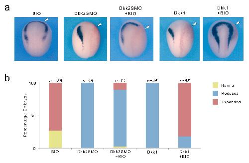 Dkk1 (50 pg) on sox10 expression was efficiently rescued by BIO treatment. The injected side (arrowheads) is to the right as indicated by the presence