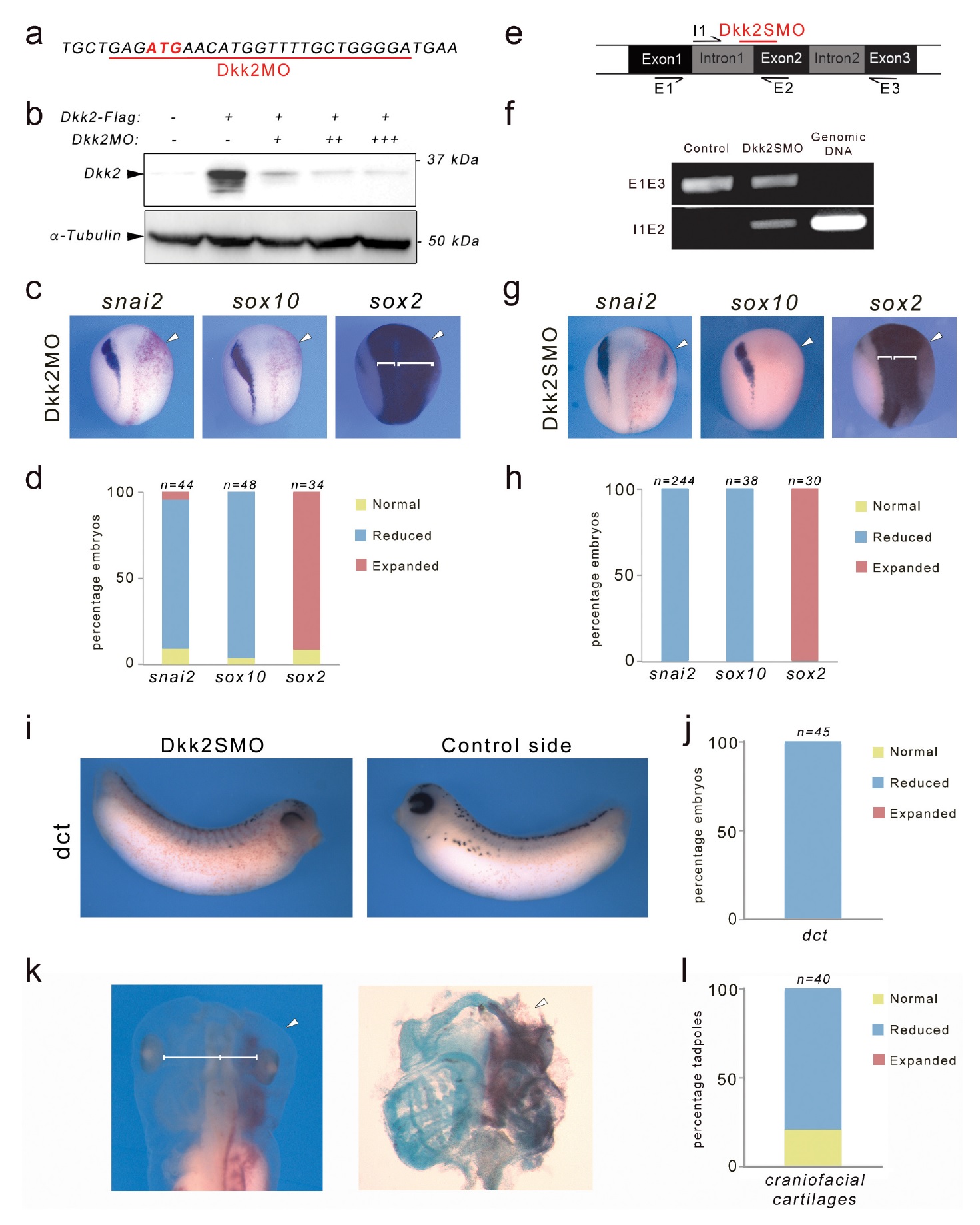 stage 30, Dkk2SMO-injected embryos show reduced dct expression. Lateral views, dorsal to top. (j) Quantification of the Dkk2SMO phenotype. (k) At