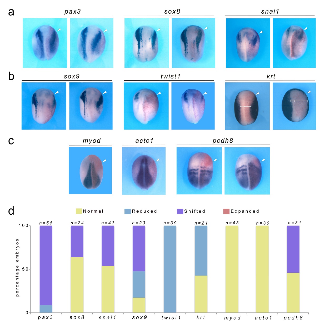 Dkk2SMO (20 ng) did not affect the expression levels of pax3, sox8 and snai1, although their expression was shifted laterally. (b) The neural crest
