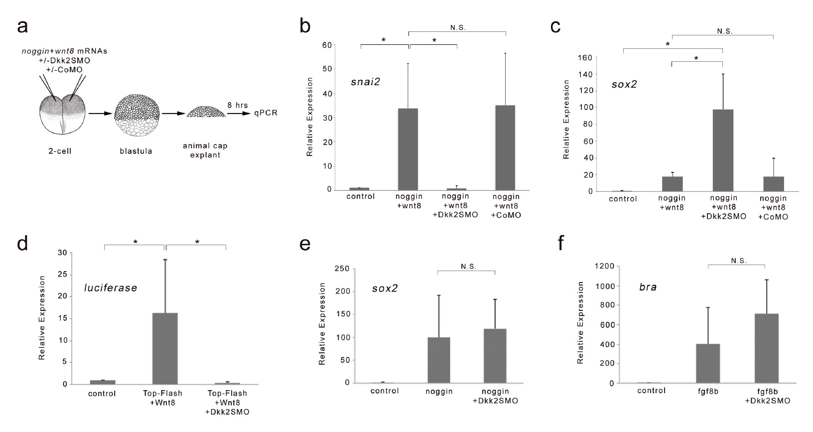 mRNA), and (f) the induction of the mesoderm gene bra by Fgf8b (100 pg mRNA) were unaffected by Dkk2SMO injection (30 ng). Graph represents