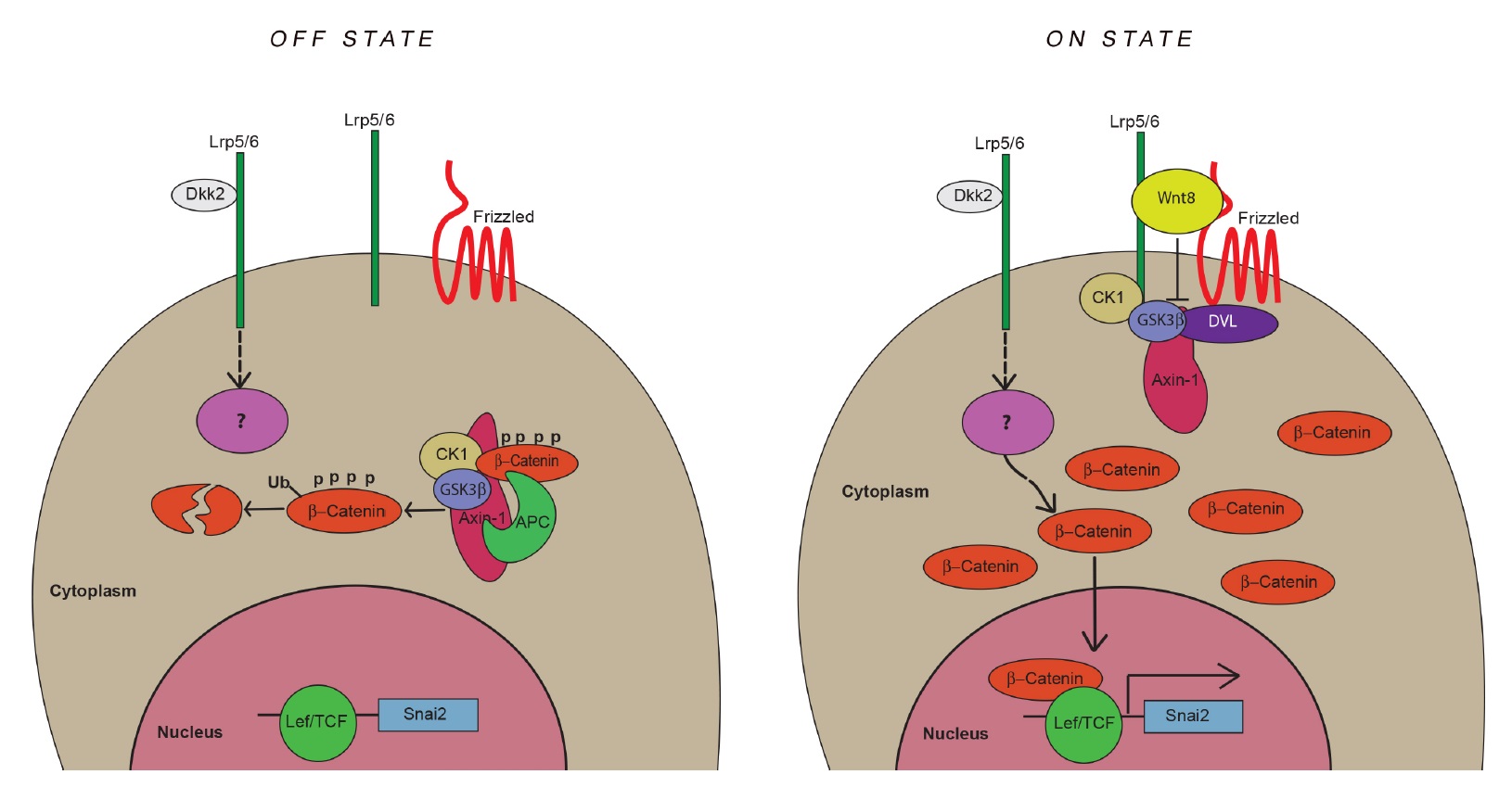 by Wnt8 and Dkk2 converging on b-catenin to promote neural crest formation (snai2 induction). The Lrp6/Wnt/Fzd complex signals through disheveled