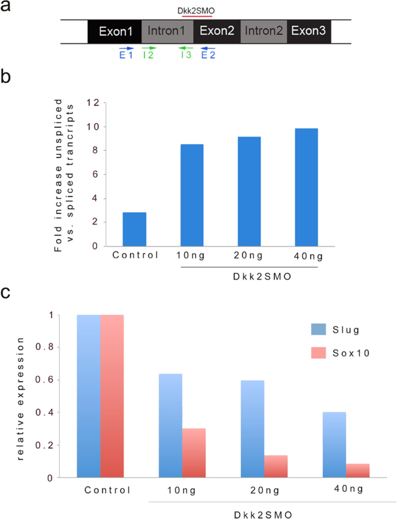 (a) Schematic representation of the dkk2 locus. The position of the splice blocking MO (Dkk2SMO) is shown (red line). The PCR primers used to analyze the spliced (E1/E2) and unspliced (I2/I3) transcripts are indicated. (b) qRT-PCR analysis of fold increase in unspliced (intron one retention) vs. spliced transcripts upon injection of increasing doses of MO. (c) Increasing amount of MO resulted in a dose-dependent decrease in snai2 and sox10 expression in these embryos. A representative experiment is shown.