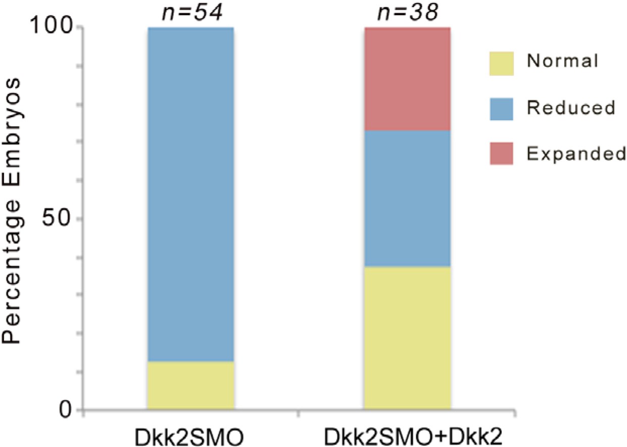 Quantification of the Dkk2SMO phenotype. The number of embryos analyzed (n) is indicated on the top of each bar.