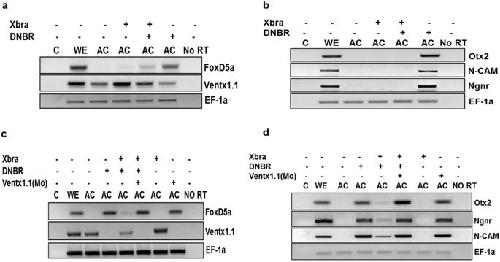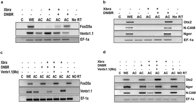 Figure 1.Ectopic expression of Xbra inhibits neurogenesis in a Ventx1.1-dependent manner in animal cap explants of Xenopus. Ventx1.1 MOs (1âng) were injected either with or without DNBR and Xbra mRNA at the 1-cell stage and dissected the animal cap at the stage 8. The dissected animal caps were harvested until stages 11 and 24 in L-15 culture medium. The relative gene expressions were analyzed by RT-PCR. (a,b) Xbra increases ventx1.1 expression and reduces the expression of early and late neural genes, including that of FoxD5a, N-CAM, Ngnr, and Otx2 while DNBR reduces ventx1.1 expression and induces the expression of neural genes, FoxD5a, N-CAM, Ngnr, and Otx2. (c,d) ventx1.1 MOs reduces ventx1.1 expression and increases the expression of neural genes, including for FoxD5a, N-CAM, Ngnr, and Otx2. C: PCR reaction without adding cDNA while No RT means PCR reaction without added reverse transcriptase.