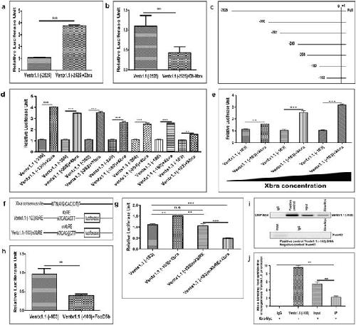 Figure 2. Identification of Xbra response elements (XbRE) within the ventx1.1 promoter region. Different serially-deleted ventx1.1 promoter constructs were co-injected either with or without DN-Xbra or Xbra at the 1-cell stage and grown until stage 11 in 30% MMR to measure the relative promoter activity at the stage 11. (a) ventx1.1 (−2525) promoter injected either with or without DN-Xbra. (b) ventx1.1 (−2525) promoter injected either with or without Xbra. (c,d) Serially-deleted promoter constructs of ventx1.1 injected either with or without Xbra. (e) ventx1.1 (−103) promoter construct injected either with or without Xbra in a dose-dependent manner. (f) Putative Xbra binding consensus was mutated by site-directed mutagenesis within ventx1.1 (−103) promoter constructs. (g) XbRE-mutated ventx1.1 (−103) mXbRE and ventx1.1 (−103) promoter constructs injected either with or without Xbra. (h) ventx1.1 (−103) promoter construct injected either with or without FoxD5b. (i,j) A ChIP-PCR assay was performed with anti-Myc antibody during gastrula. All ChIP bindings were measured by PCR using specific primers. ventx1.1 (−103) promoter DNA was used as a positive control while Xvent2 coding region primers were used as a negative control for all the ChIP-PCR experiments. All the relative promoter activity data are shown as mean ± SE. The ChIP-PCR band intensities were quantified using a densitometer.