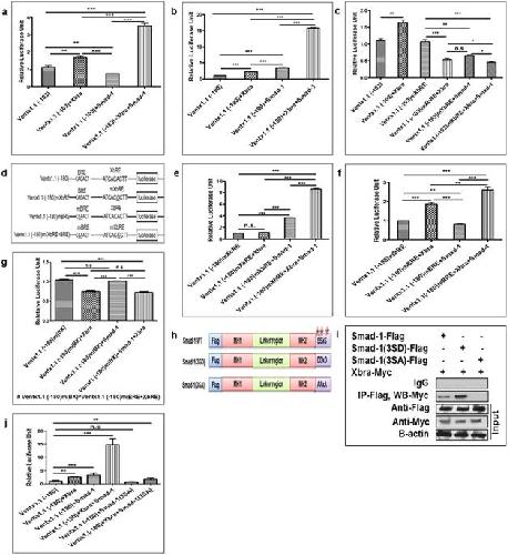 Figure 3. Xbra and Smad-1 synergistically regulate ventx1.1 transcription. Different ventx1.1 promoter constructs were co-injected either with or without Smad-1 and with Xbra, either in combination or separately, at the 1-cell stage and grown until stage 11 to measure the relative promoter activity. (a,b) ventx1.1 (−103 and −180) injected with Xbra and Smad-1, in combination or separately. (c) XbRE-mutated ventx1.1 (−103) mXbRE and ventx1.1 (−103) injected with Xbra and Smad-1, in combination or separately, in separate groups. (d) XbRE and BRE were mutated by site-directed mutagenesis in different ventx1.1 (−180) promoter constructs. (e) XbRE-mutated ventx1.1 (−180) mXbRE injected either with or without Xbra and Smad-1, in combination or separately. (f) BRE-mutated ventx1.1 (−180) mBRE injected either with or without Xbra and Smad-1, in combination or separately. (g) The doubly mutated ventx1.1 (−180) m(BRE + XbRE) injected either with or without Xbra and Smad-1, in combination or separately. (h,i) Flag-Smad-1, Flag-Smad-1 (3SD), and Flag-Smad-1 (3SA) constructs were co-injected with Myc-Xbra and immunoprecipitation was performed with an anti-Flag antibody. (j) ventx1.1 (−180) injected either with or without Myc-Xbra, Flag-Smad-1, and Flag-Smad-1 (3SA) constructs in different groups, in combination or separately. All relative promoter activity data are shown as mean ± SE.