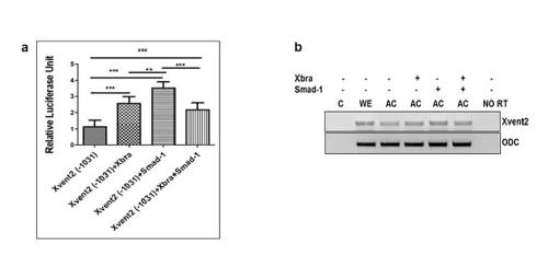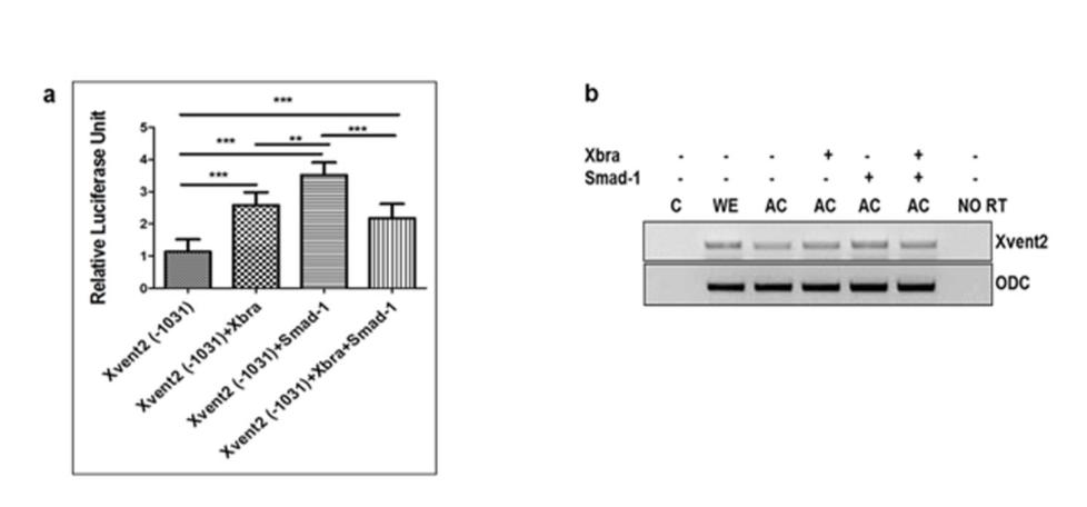 Supplementary Figure 1. Physical interaction of Smad-1 and Xbra uniquely regulates ventx1.1 transcription activation, but not that of Xvent2, in the Xvent family. We co-injected the Xvent2 promoter region construct with Xbra and Smad-1, in combination or separately, at the 1-cell stage and dissected the animal cap of injected embryos at stage 8. Dissected animal caps were also harvested in L-15 culture media until stage 11, followed by RT-PCR and reporter gene assay of the samples. (a) Xvent2 (-1031) promoter region injected with Xbra and Smad-1, in combination or separately. (b) Embryos were co-injected with Xbra and Smad-1, separately or in combination to perform the RT-PCR at the stage 11. All relative promoter activity experiments were performed in triplicate. All relative promoter activity data are shown as mean ± SE.