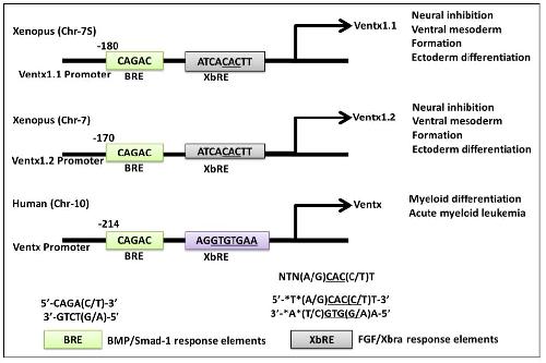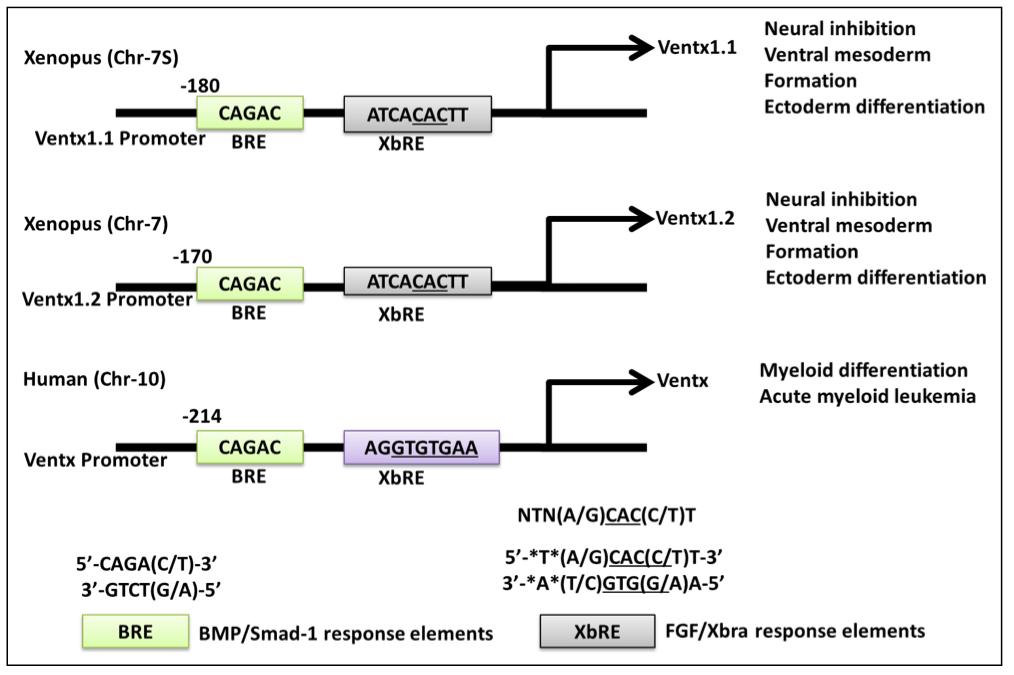 Supplementary Figure 2b. Putative Smad-1 (BRE) and Xbra (XbRE) binding response elements might be evolutionarily conserved in the promoter region of ventx1.1s (Xenopus) and VENTX (human). Putative BRE and XbRE may be evolutionarily conserved within the proximal promoter region of ventx1.1s and ventx1.2 (Xvent1) in Xenopus as well as in VENTX for human. Violet color indicates complementary binding site for Xbra within the promoter of Ventx.