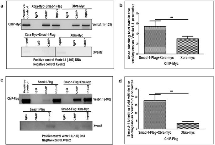 Figure 4. Xbra enhances Smad-1 binding affinity on its cis-acting element (BRE) within the ventx1.1 promoter. To perform ChIP-PCR assays, mRNA was co-injected either with or without Smad-1 at the 1-cell stage and harvested the embryos until stage 11 in 30% MMR. (a,b) The ChIP-PCR assay was performed with the anti-Myc antibody. (c,d) The ChIP-PCR assay performed with the anti-Flag antibody at the stage 11. All bindings were measured by PCR method using specific primers. ventx1.1 (−103 and −180) promoter DNA served as positive control. The ChIP-PCR band intensity was quantified using a densitometer.